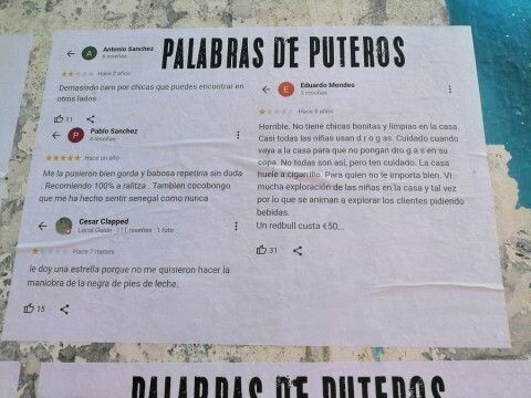 Esto da ejemplo de que pasa cuando el planeta de lo simios (película) ocurre en la vida real , creo que se debería respetar alas señoritas que hacen feliz a los hombres hay algunas muy cariñosas y majas salen pasean y hacen lo que quieren y ganan mucho más que las piojosas y seguro k tmb piojosos que pintaron eso no niego q por algunas zonas de la geografía española se las fuercen pero tmb hay hombres prostitutos jovencitos q tienen q complacer a carmenes Lomanas q se gastan pensiones de maridos mientras no dieron palo al agua en cambio cuando una mujer no quiere complacer no se le fuerza se va y se le paga a esa señora con y con nuestro dinero asin vais asin lo gastáis izquierda dando ejemplo porai dijieron solo sitios ricos pero pobres y desdichados siempre hay pa lo bueno y pa lo malo no es ni etnias ni estatus coca y puta Wiski hasta el presidente quien nunca dijo nunca