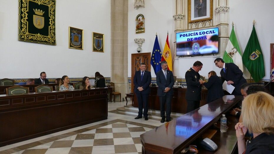 Palabras como esfuerzo, responsabilidad, compromiso, implicación, colaboración y orgullo se han escuchado en este acto de entrega de medallas y distinciones que ha venido a poner en valor, como cada año, el trabajo que hace la Policía Local en particular, unido al que de forma estrecha se comparte con Policía Nacional, Guardia Civil y Protección Civil. Y es que si Rota puede presumir de un alto índice de seguridad, es porque existe detrás un grupo de hombres y mujeres que forman parte de estos cuerpos que dedican horas de servicio, y a veces, fuera del horario laboral, a trabajar por una localidad segura y en paz.  Lo decía así el delegado de la Policía y primer teniente de alcalde, Daniel Manrique de Lara, al inicio del acto que ha estado presidido por el alcalde de Rota, Javier Ruiz, y el inspector jefe de la Policía Local, Manuel Muñoz, y que ha comenzado con la proyección de un vídeo resumen de las labores diarias de los agentes municipales.