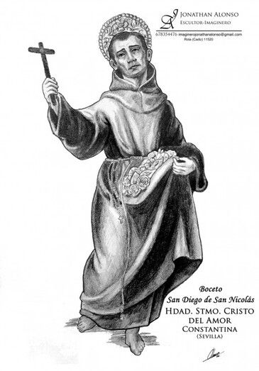 El escultor roteño Jonathan Alonso continúa recibiendo encargos de hermandades de fuera de la localidad aumentando así el número de obras que, con su sello, empiezan a verse por localidades de provincias cercanas. En este caso, ha sido la junta de gobierno de la Hermandad del Santísimo Cristo del Amor de Constantina (Sevilla), la que le ha encargado al joven imaginero la talla de San Diego.