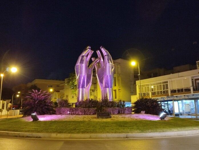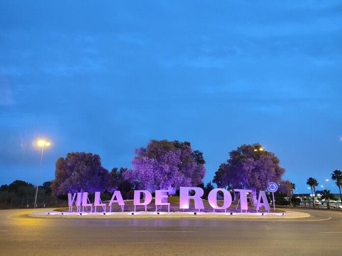 A la rotonda de "Las Manos", que es habitual verla iluminada en días señalados para sensibilizar sobre enfermedades raras, colectivos minoritarios y sus necesidades, etc., se han unido el arco de la villa y la glorieta de entrada "Villa de Rota".