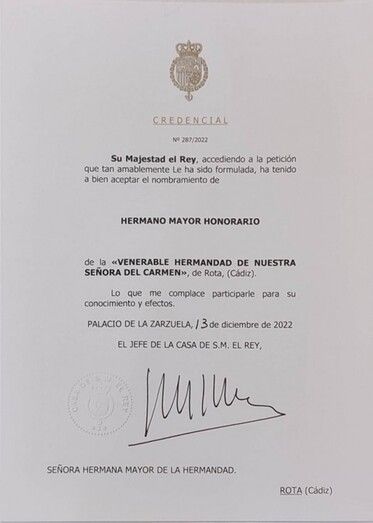 [Img #182329]La Hermandad de Nuestra Señora del Carmen de Rota ha anunciado que S.M. el Rey Felipe VI ha aceptado la solicitud que le enviaron para nombrarlo hermano mayor honorario de la misma.