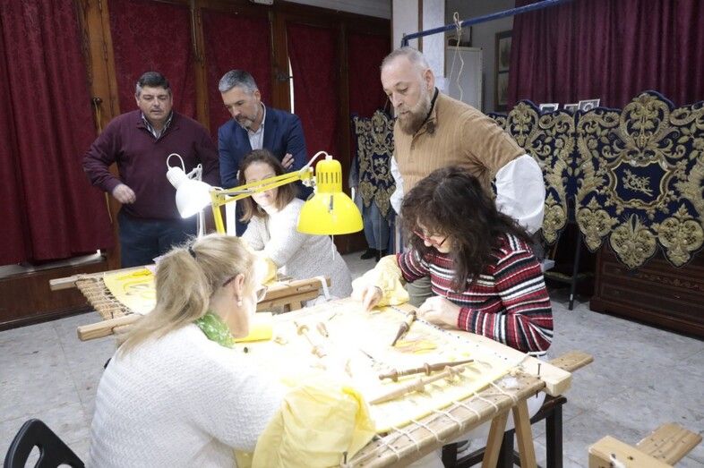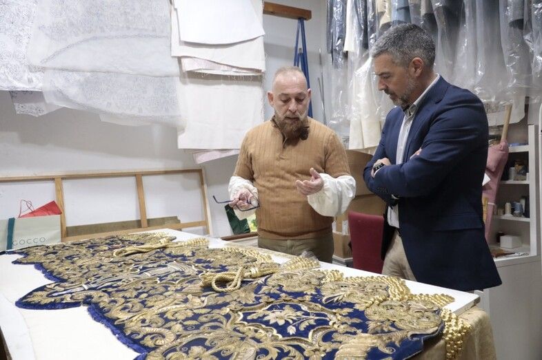 El primer edil acompañado por el primer teniente de alcalde Daniel Manrique, ha podido comprobar uno de los trabajos más relevantes que están realizando en estos momentos este taller, como es el encargo de la Hermandad de las Aguas de Sevilla para la limpieza en los bordados del palio de María Santísima de Guadalupe que diseñara Antonio Dubé de Luque y que fueron ejecutadas en oro y sedas de colores, sobre terciopelo azul, en el taller de Esperanza Elena Caro entre 1988 y 1992.