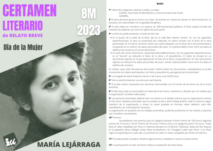 Con motivo de la celebración del Día Internacional de la Mujer Trabajadora, que se conmemora el 8 de marzo, Izquierda Unida ha vuelto a convocar el Certamen Literario "8M" que este año estará dedicado a otra escritora silenciada, contemporánea a la Generación del 98, María Lejárraga. Una autora que destacó por su éxito teatral y sus ideas feministas sobre la acción de las mujeres en la sociedad, destacando sus obras "Cartas a las mujeres de España" (1914) y "Feminismo, feminidad y españolismo" (1917).