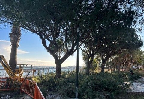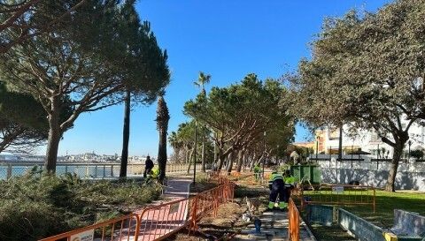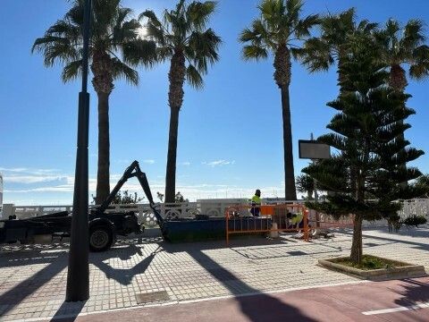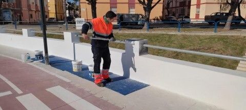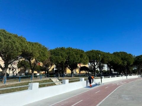 Pintado de vallas, sustitución de solería y poda de pinos en el paseo marítimo del Rompidillo