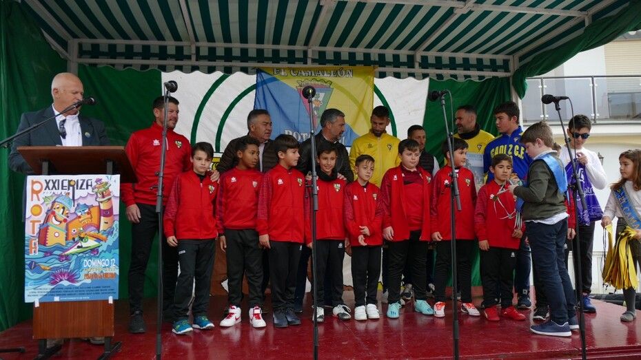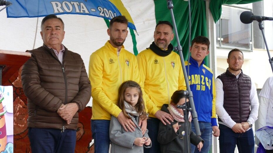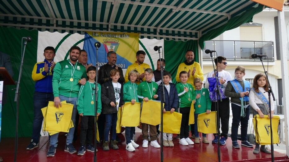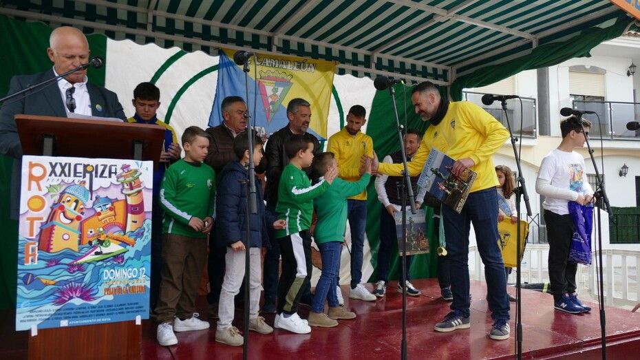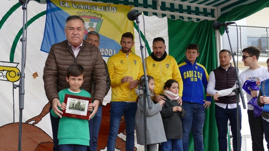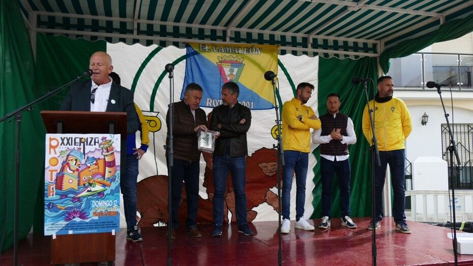 Sobre el escenario los han acompañado el presidente de la peña cadista, Miguel Ángel Cebrián, el futbolista roteño José Mari, el ex jugador del Cádiz, Manuel Villalba, el delegado de Deportes, José Antonio Medina, y el alcalde de Rota, Javier Ruiz, que se han encargado de entregar las placas. Los dos representantes políticos han valorado positivamente la organización de este Trofeo Camaleón "Memorial Julio Durán" por lo que representa para el fútbol de cantera, y han agradecido además la labor que hace la peña cadista con la Erizá Popular que en esta edición ha conseguido de nuevo que la plaza de La Cantera esté concurrida y el ambiente de Carnaval se viva durante este domingo.