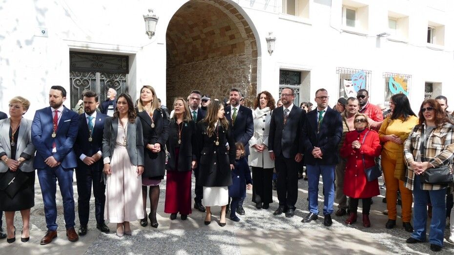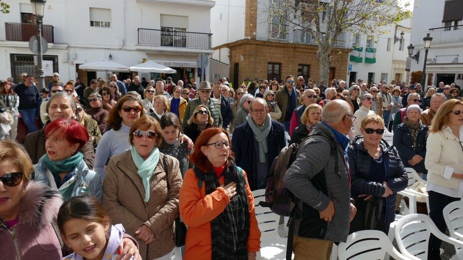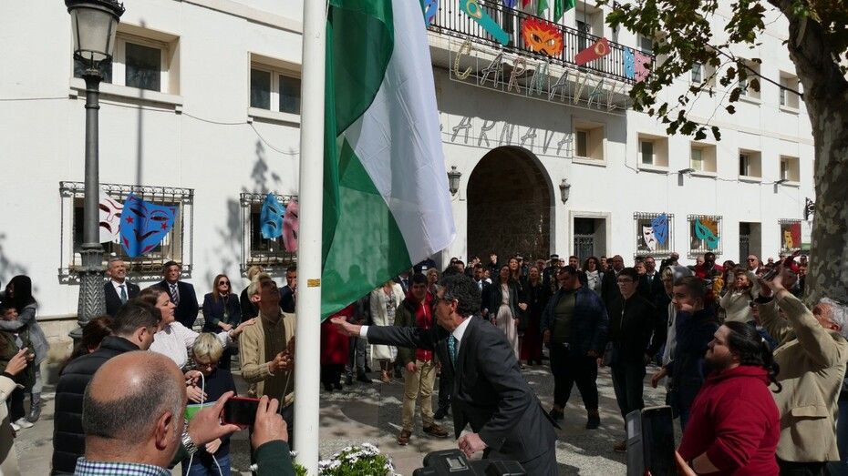 Con una plaza de España llena de público, los miembros de la Corporación municipal, además de algunas autoridades civiles y muchos ciudadanos, los representantes de esta asociación han portado la gran bandera blanca y verde que ellos mismos se han encargado de izar y que ondeará durante todo este 28F en este punto céntrico en señal de la festividad de todos los andaluces.