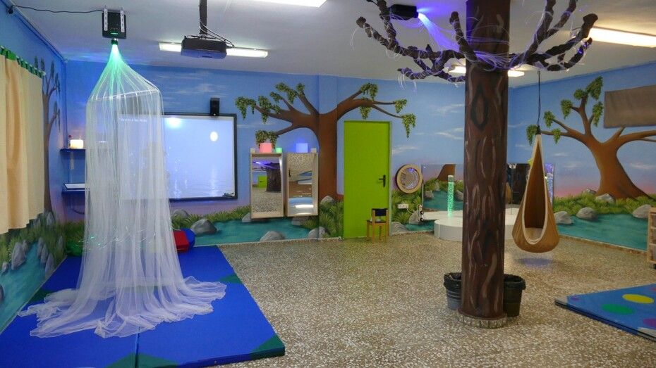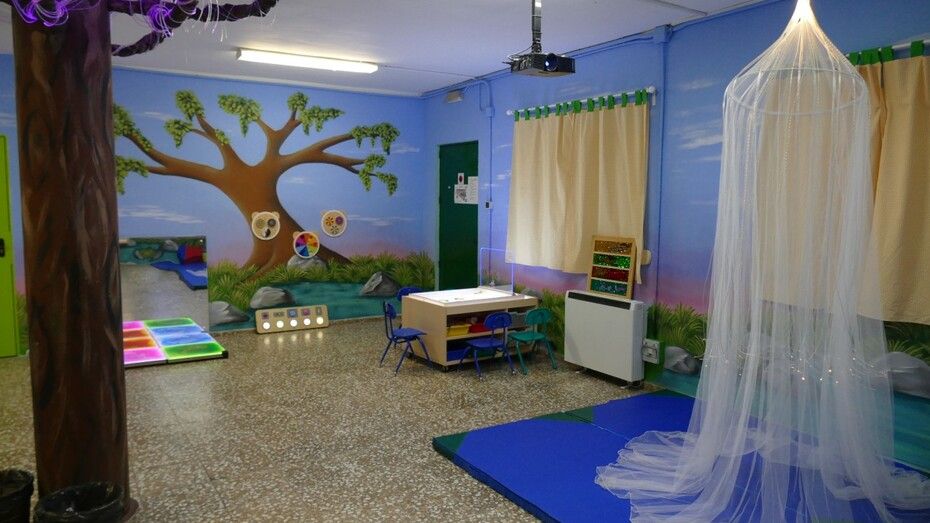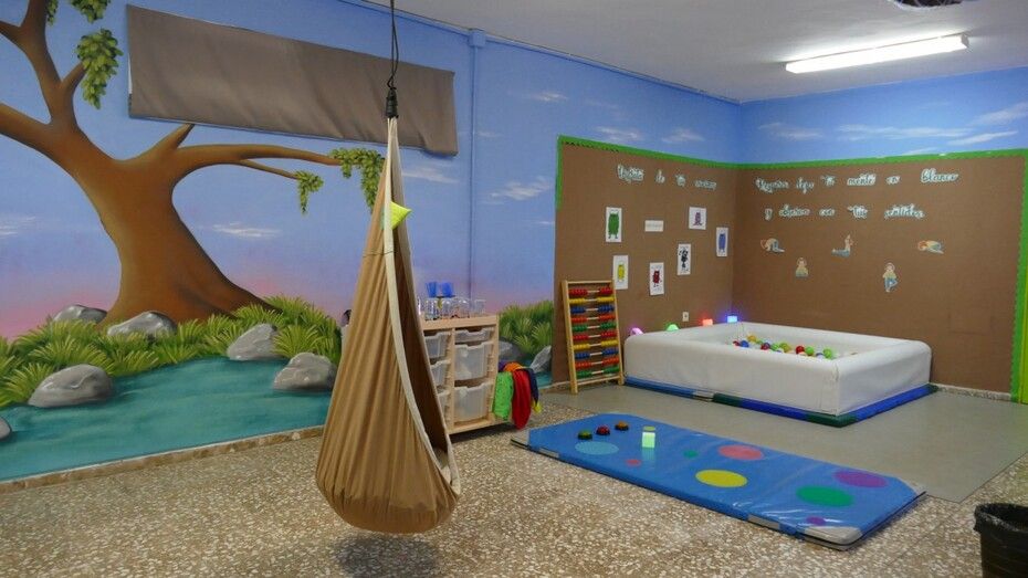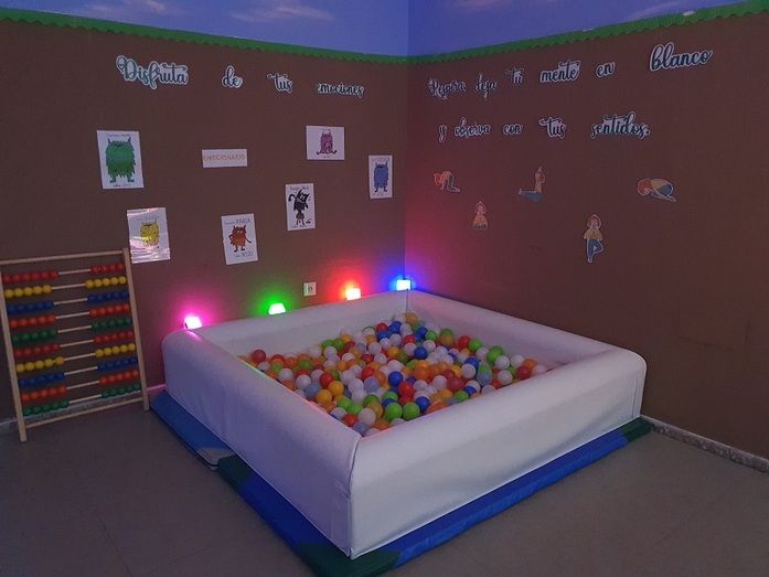 Dado que hacer un par de años se cerró una de las dos líneas de 3 años, y por tanto, un aula de Infantil quedó vacía, se planteó la posibilidad de crear este aula como un espacio necesario para el trabajo de infinidad de aspectos curriculares y de estimulación de los sentidos, así como un ambiente relajado y de calma para momentos en los que el alumno tenga que recuperar el bienestar consigo mismo.