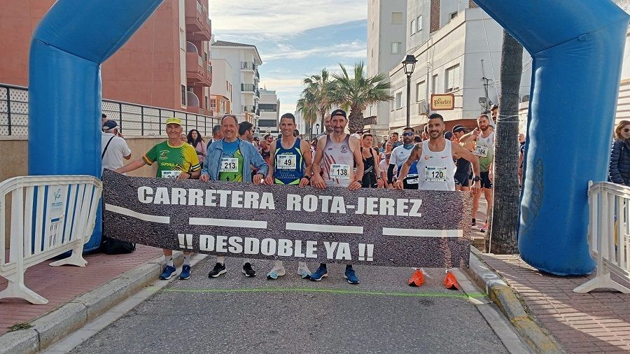 Los atletas, de diferentes puntos de la provincia y otras localidades de fuera, posaron con una pancarta de inicio a favor del desdoble de la carretera A-491, hasta que el alcalde de Rota, Javier Ruiz, dio el pistoletazo de salida para los 21 kilómetros de los que consta esta media maratón.