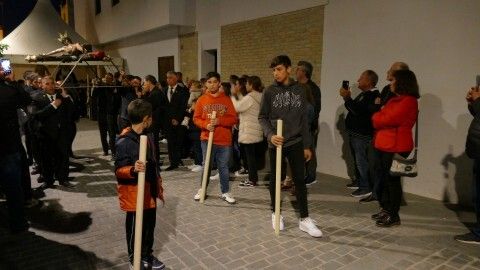 El Cristo del Amor en portacruz, y la virgen de la Esperanza y el Resucitado en parihuela, han llegado a la capilla salesiana donde se prepararán para salir en las noches del Lunes Santo y en la tarde del Domingo de Resurrección.