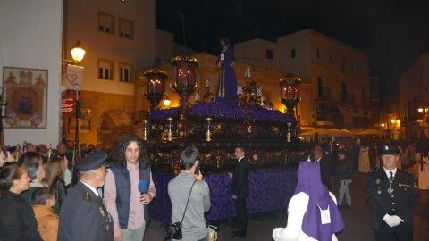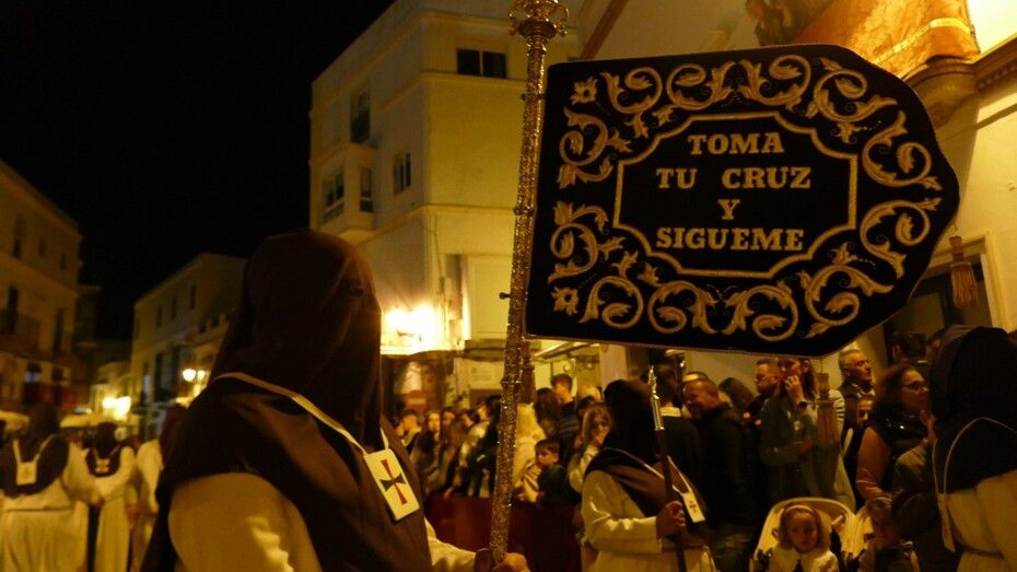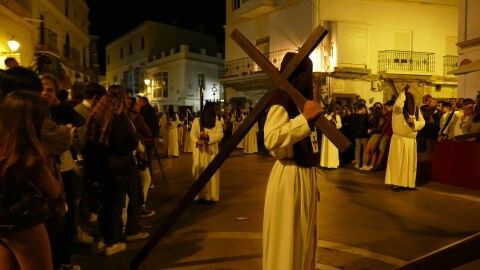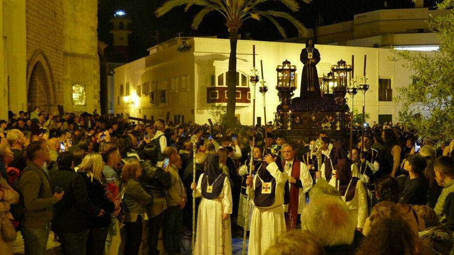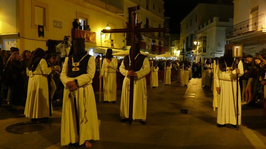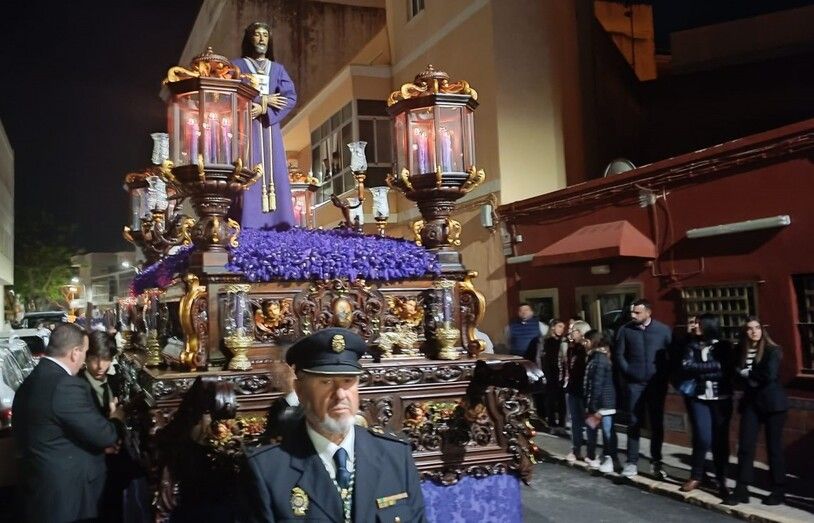 [Img #189099]El racheo de los costaleros y el tintineo de alguna cadena atada a los tobillos de unos pocos hermanos han  sonado al paso de Jesús Cautivo y ha marcado el único sonido que se ha escuchado en esta procesión que no lleva acompañamiento musical y que con su particular manera de andar deja su sello personal entre los cofrades y público en general.  A ambos lados, como escoltas, dos policías nacionales de la Asociación Santo Ángel de Rota (ASACRO) que desde hace años acompaña a algunos titulares para dar un mayor realce a la salida procesional.