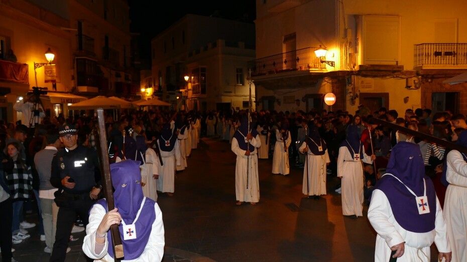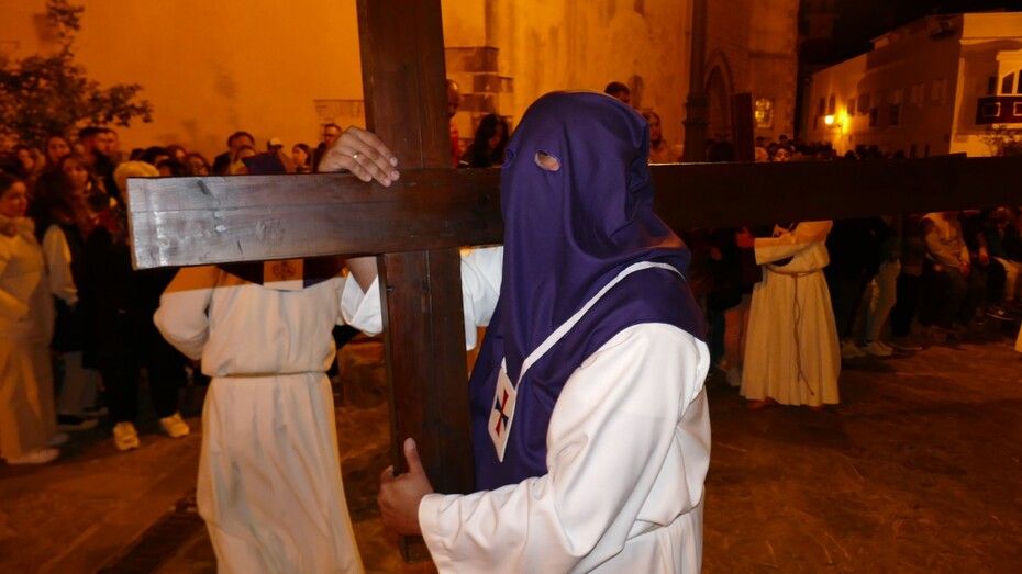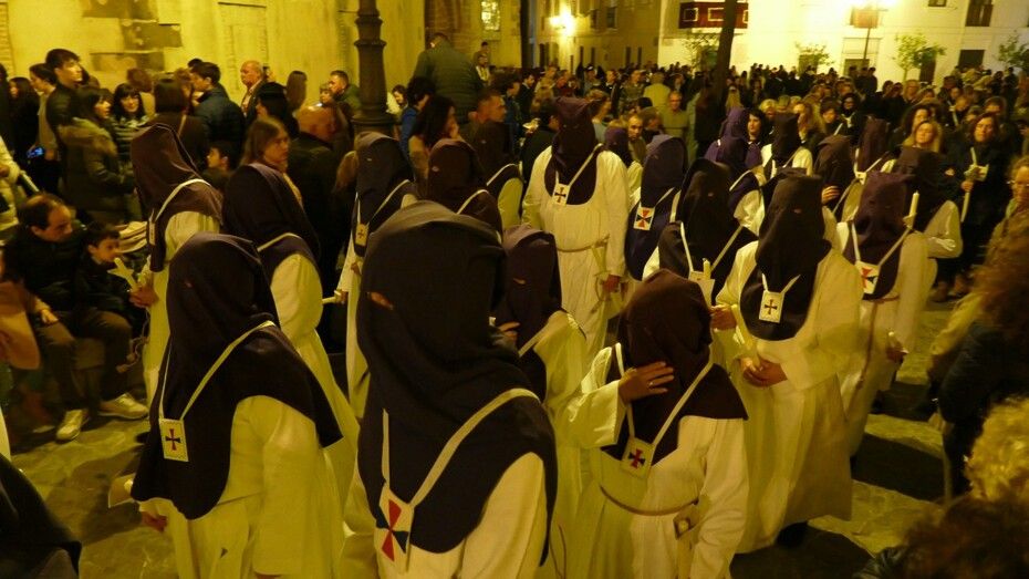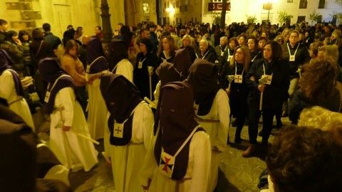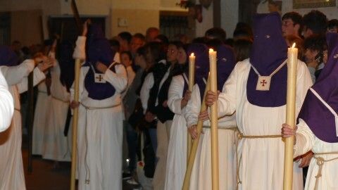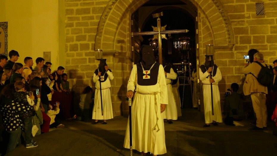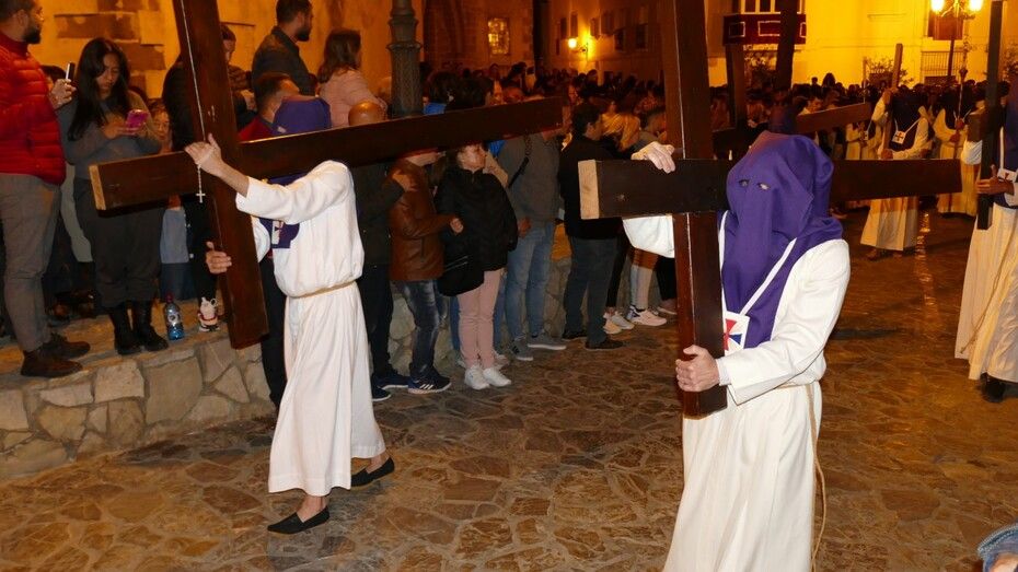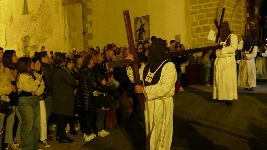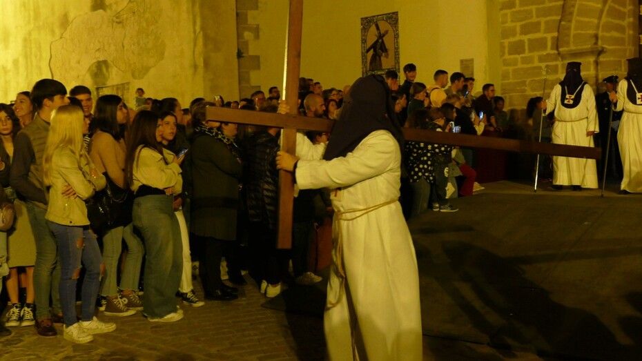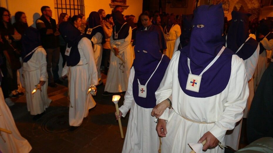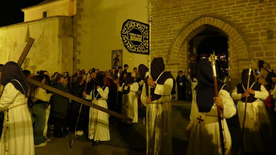 Túnica beige y antifaz morado sin capirote marcaban la estampa de la noche más sobria de la Semana Santa, con casi 300 hermanos en total. Entre ellos, luciendo hábito unos 50 portando cirios, unos 85 con cruces de madera y otros, con las insignias de esta Hermandad de la Veracruz que tiene como titular a una imagen que siembra silencio en la noche y deja a su paso un halo de  recogimiento indiscutible.  Especialmente significativo cada año es el numeroso grupo de hermanas de vela que van tras el paso, unas 130, que son fiel reflejo de la devoción al Cautivo.