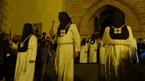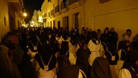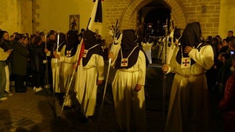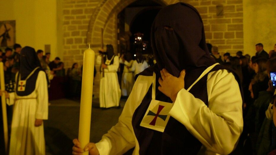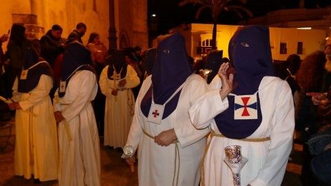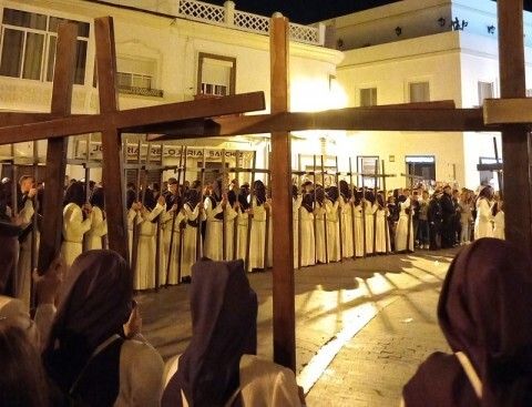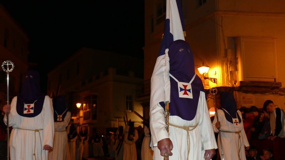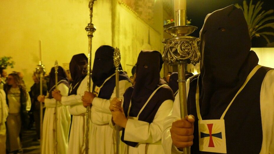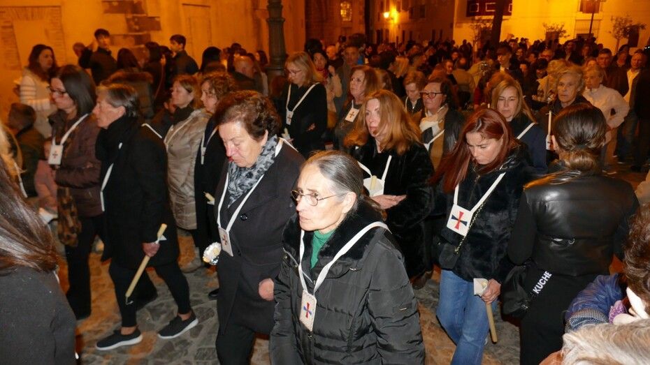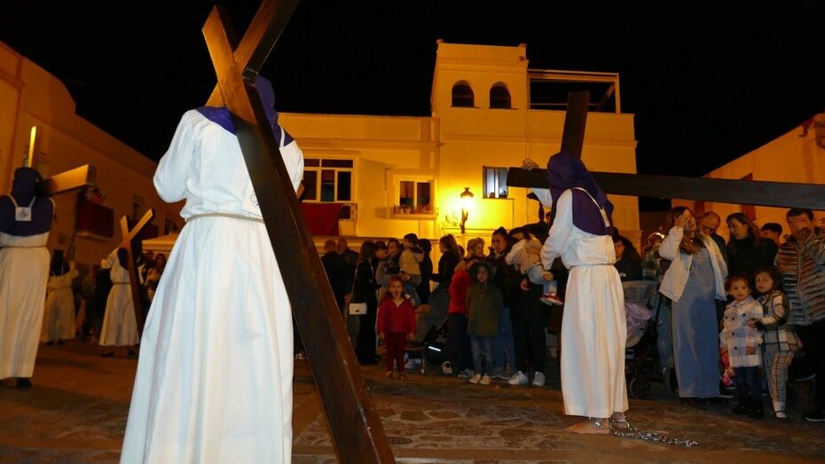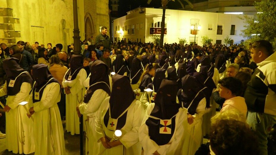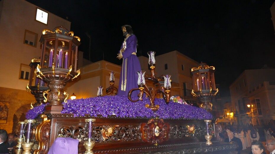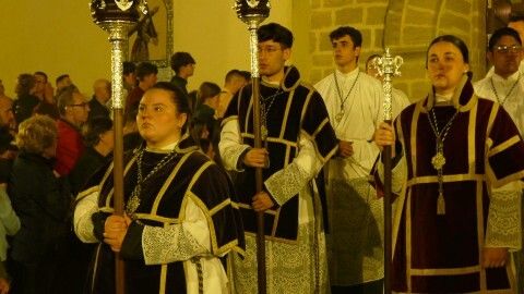 Túnica beige y antifaz morado sin capirote marcaban la estampa de la noche más sobria de la Semana Santa, con casi 300 hermanos en total. Entre ellos, luciendo hábito unos 50 portando cirios, unos 85 con cruces de madera y otros, con las insignias de esta Hermandad de la Veracruz que tiene como titular a una imagen que siembra silencio en la noche y deja a su paso un halo de  recogimiento indiscutible.  Especialmente significativo cada año es el numeroso grupo de hermanas de vela que van tras el paso, unas 130, que son fiel reflejo de la devoción al Cautivo.