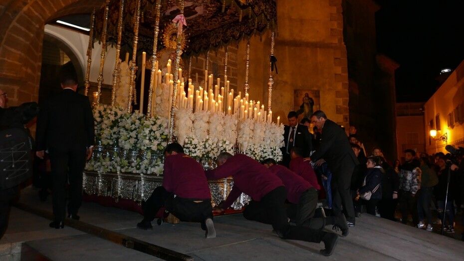 Tras otro largo tramo de hermanos con cirios, varas e insignias, procesiona esta larga noche María Santísima de la Amargura, con la banda de música de la Hermandad del Nazareno dedicándole piezas con las que la cuadrilla de costaleros se luce.