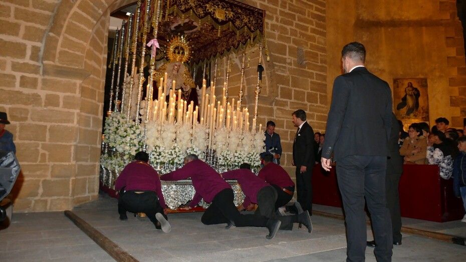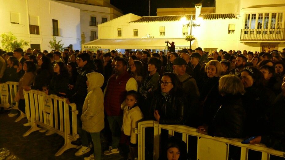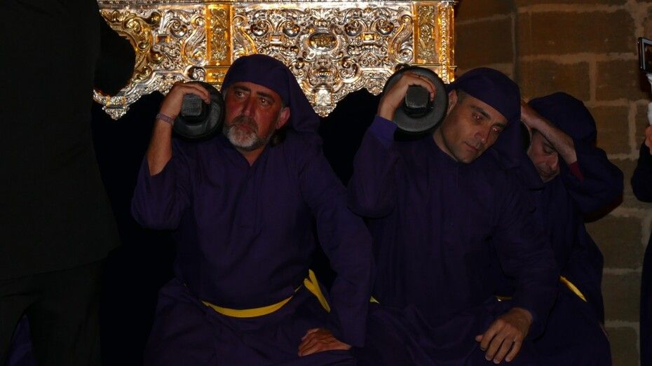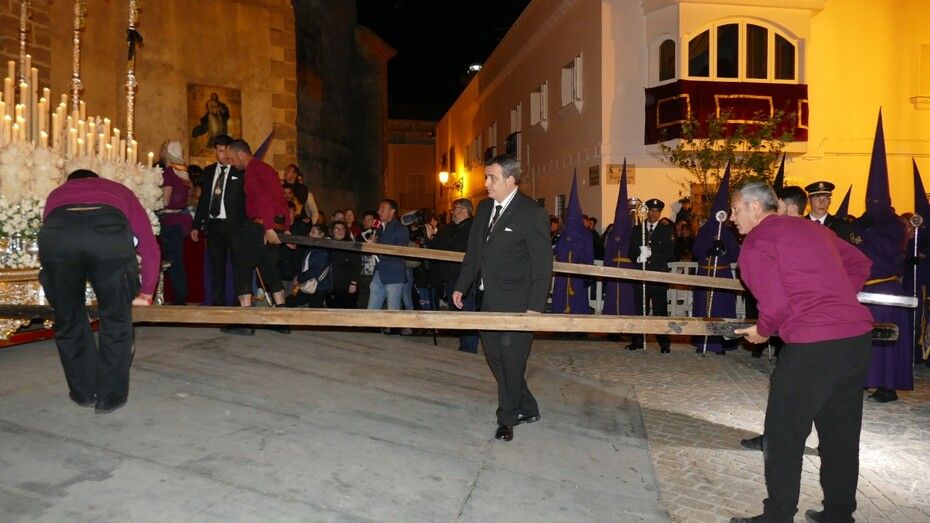 Con algunos nazarenos ya en la plaza, enseguida la cuadrilla de costaleros de la virgen ha empezado las maniobras para montar el paso, guiado por el capataz Pablo Barba, y poder posicionarse a la derecha de la iglesia mayor para esperar la salida del Señor de Rota. Ha sido a los pocos minutos, sobre las 2.25 horas cuando Jesús Nazareno aparecía por el dintel de la puerta de la parroquia donde los costaleros, guiados por Diego Mateos Laynez, han tenido que maniobrar igualmente para salir a la calle.