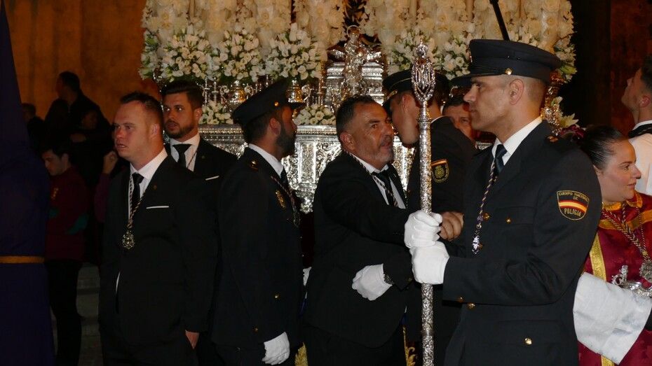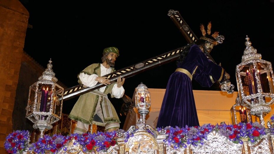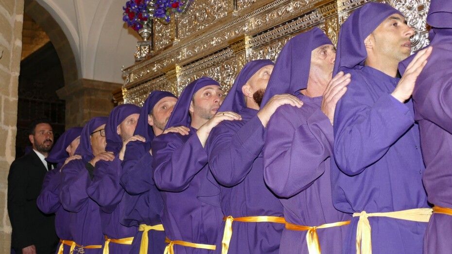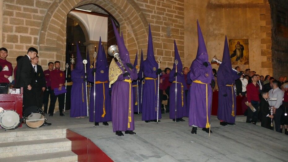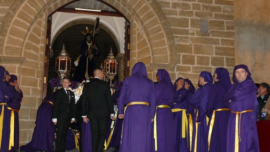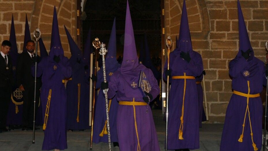 A las dos de la madrugada abrían las puertas de la parroquia de Nuestra Señora de la O y comenzaba el desfile de algunos de los hermanos con túnica morada, varas e insignias que se han ido posicionando en la plaza Bartolomé Pérez a la espera de que los titulares protagonistas en esta larga noche, ocuparan su lugar para el Sermón de Pasión.