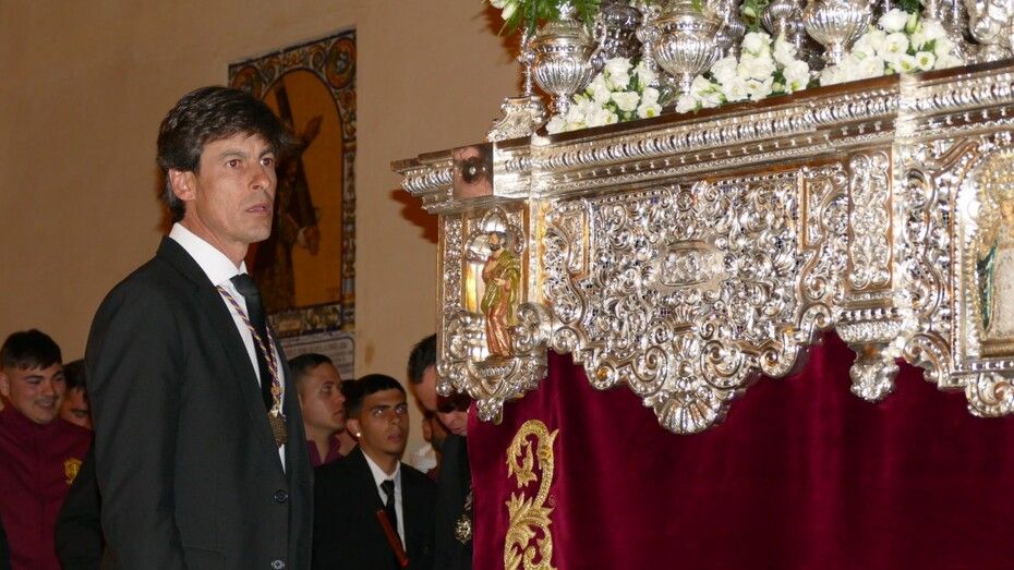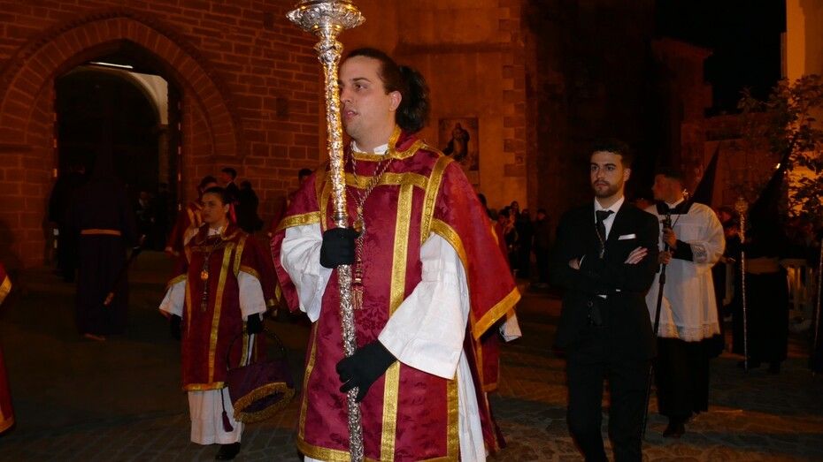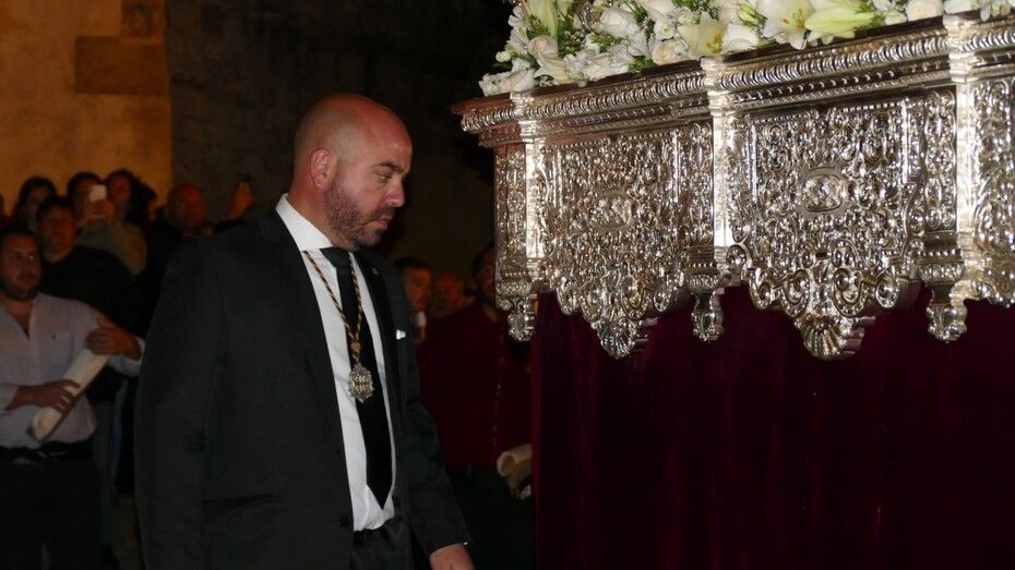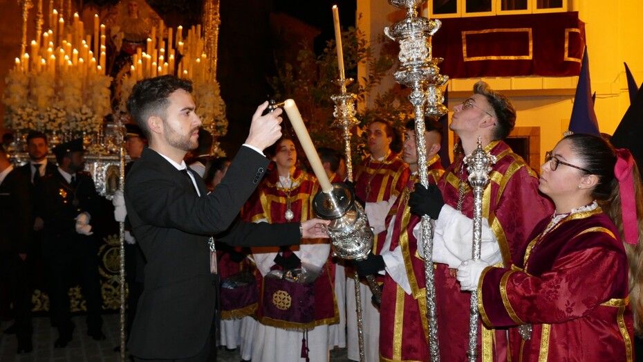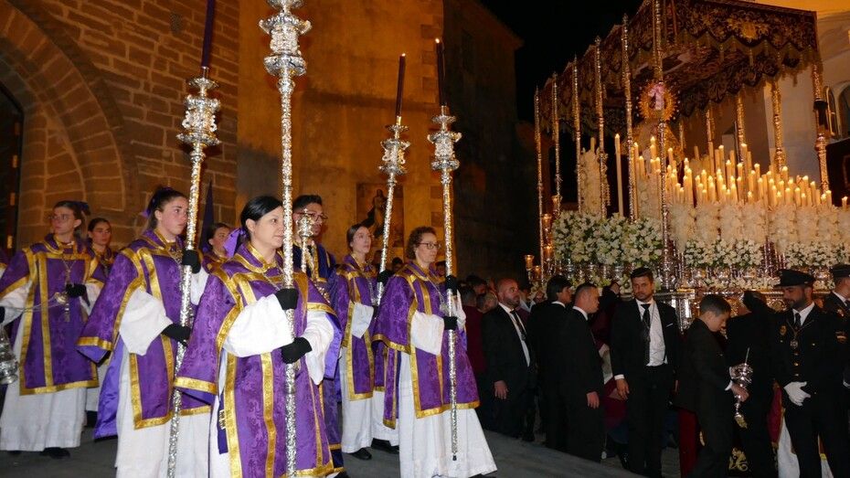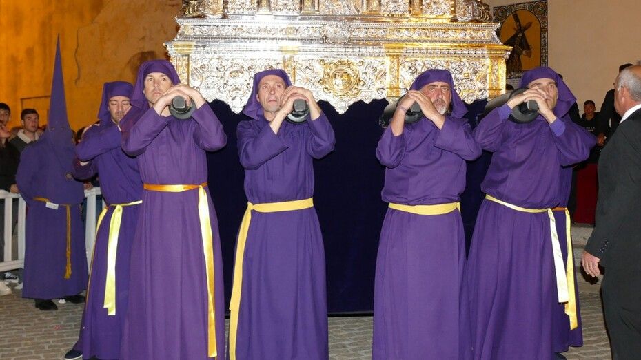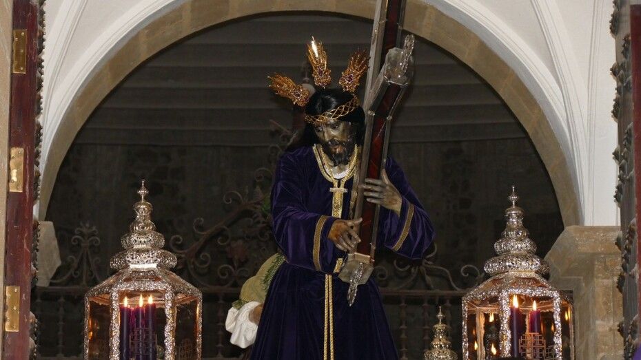 A las dos de la madrugada abrían las puertas de la parroquia de Nuestra Señora de la O y comenzaba el desfile de algunos de los hermanos con túnica morada, varas e insignias que se han ido posicionando en la plaza Bartolomé Pérez a la espera de que los titulares protagonistas en esta larga noche, ocuparan su lugar para el Sermón de Pasión.