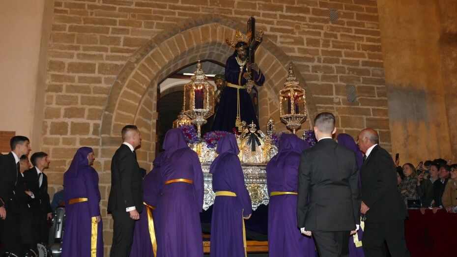 Te dejamos el itinerario hasta su recogida: plaza Bartolomé Pérez (donde se celebrará el tradicional Sermón de la Pasión), plazoleta del Padre Eugenio, Pérez de Bedoya, plaza Barroso, Constitución (dcha.), plaza de España, Pozo de la Villa, Álvaro Méndez, plaza Andalucía, Veracruz, Calvario, San Antonio, Juan Sebastián Elcano, Duque de Ahumada, Rubén Darío, avenida San Fernando (dcha.), avenida María Auxiliadora (izd), plaza San Roque, Castelar, Isaac Peral (izqda.), Rosario, plaza Andalucía, Blas Infante, Higuereta (izqda.), Arco de Regla, Fermín Salvochea, (si las condiciones climatológicas lo permiten se accederá al muelle pesquero por calle Gravina), plaza Bartolomé Pérez, a su Templo.