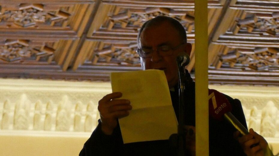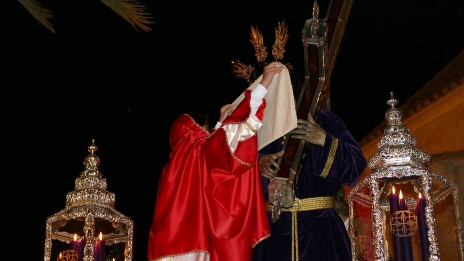 Una vez colocado el Señor junto a la virgen de cara a una plaza muy concurrida, ha dado comienzo el Sermón de Pasión. Ha sido el cura párroco de la O, José Arjona Gil, el que desde la ventana de la Alcaldía, en el Castillo de Luna, ha dado el sermón junto a dos saeteros que han cantado la sentencia de Pilatos y la revocación de la misma por parte del ángel. El párroco se ha vuelto a acordar de los pobres, los necesitados, los enfermos o parados. El Sermón de Pasión recuerda el pasaje clave previo a la crucifixión de Jesús, y continúa con el momento en el que la Verónica, este año encarnada por Elsa Rodríguez Almisas, sube al paso a enjugar el rostro de Jesús con un lienzo pintado por Pablo Barba hace unos años, que muestra al público.