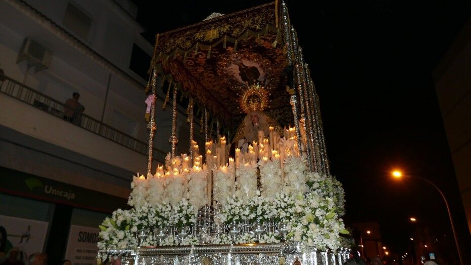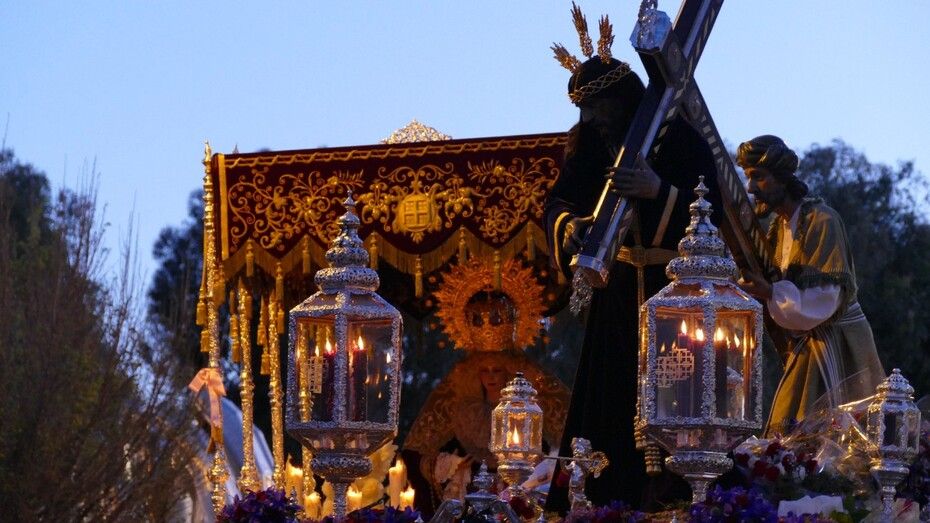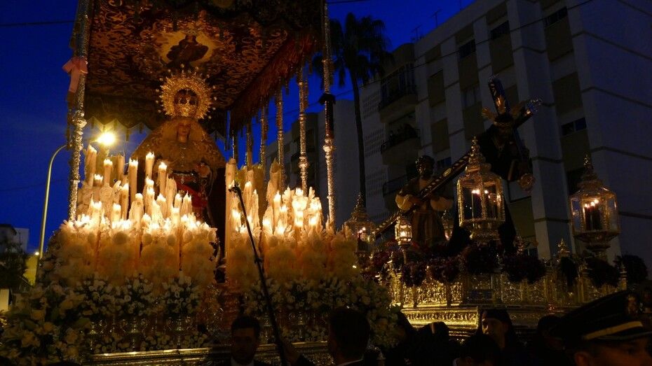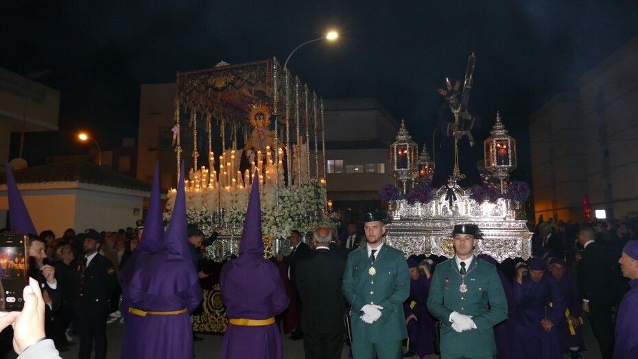 Diez minutos antes de las siete de la mañana, aún sin amanecer, llegaba el cortejo a la calle Rubén Darío donde desde hacía más de media hora ya había roteños cogiendo sitio para no perder detalle de esta estampa que se recuperó el año pasado, pero que no se repetía desde 1986. El paso de Jesús Nazareno, guiado por Diego Mateos Laynez, se paraba a la altura de la rotonda de los donantes, y ahí esperó unos 20 minutos a que el palio, que guiaba Pablo Barba, se pusiera en paralelo. Se vivía así uno de los momentos más esperados de esta salida procesional permitiendo que Jesús y su madre recorrieran esta calle hasta enfilar los primeros metros de la avenida San Fernando.