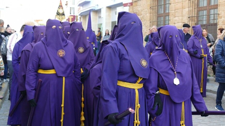 Terminado el tramo acordado, los hermanos penitentes ha vuelto a formar filas como al inicio de la estación de penitencia, y el paso del Señor de Rota delante y la Amargura detrás, ha enfilado la avenida San Fernando en una mañana de Viernes Santo que ha amanecido sin viento y augurando que hoy será una buena jornada cofradiera.