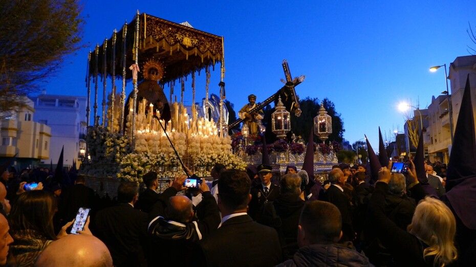 Mientras el largo cortejo de unos 1.000 hermanos de hábito ocupaba los dos márgenes de la calle Rubén Darío, los dos pasos han ido juntos, despacio, luciéndose sabedores de que era un momento para inmortalizar, sin prisas. En esta estampa ha llegado el amanecer y la luz del día que ha dejado ver mejor las caras de un Nazareno y una Amargura que levantan especial devoción en la villa roteña.
