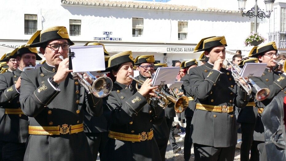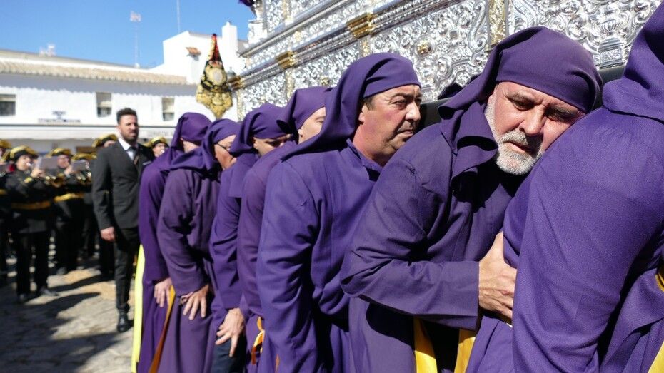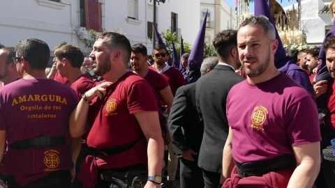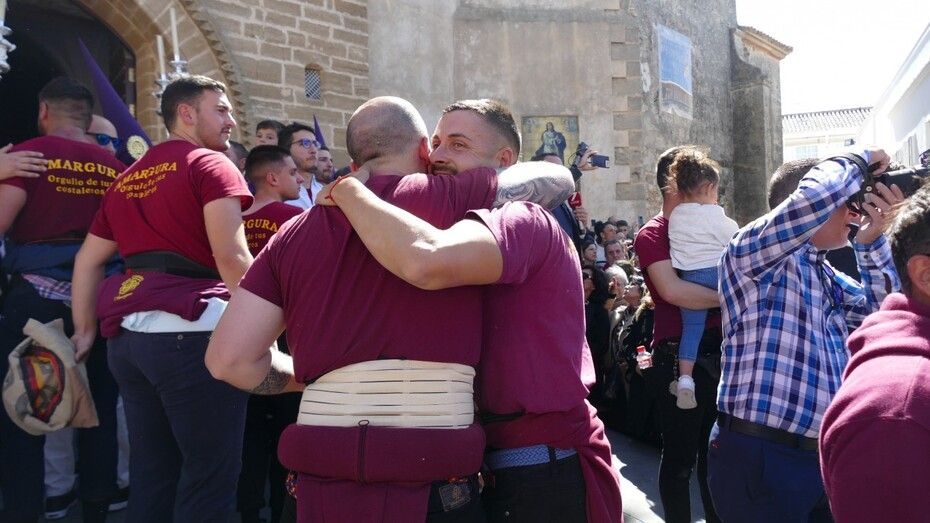 [Img #189572]Tras este cúmulo de sentimientos, casi una hora después, a las 12.20 horas, entraba por la plaza Bartolomé Pérez María Santísima de la Amargura, espléndida a la luz del día y cargada por una cuadrilla que ha guiado Pablo Barba y que al final del recorrido también ha acabado entre abrazos y lágrimas por una estación de penitencia completada. Antes, se han lucido, el paso ha girado 360 grados al son de los acordes de la banda del Nazareno que ha puesto el punto especial a la despedida de una Madrugá que los roteños han disfrutado y han aplaudido pese al calor que a esa hora se soportaba en una plaza que, resguardada del viento de levante, gozaba de temperaturas  primaverales.