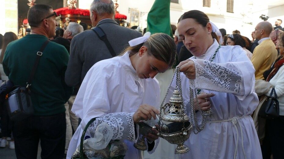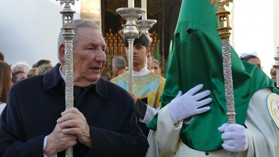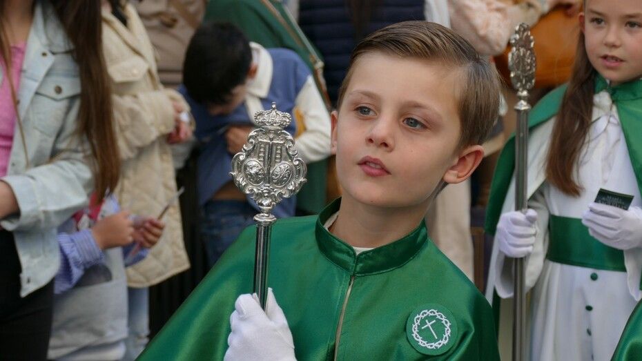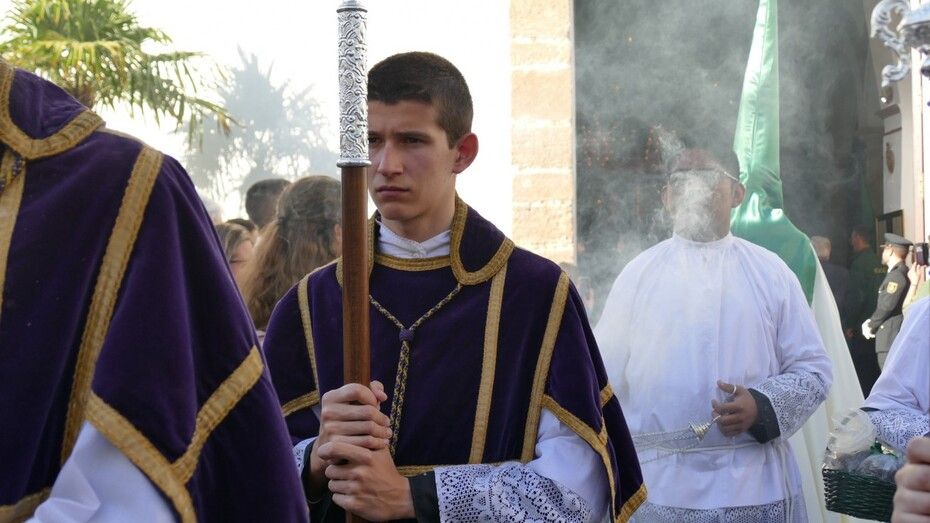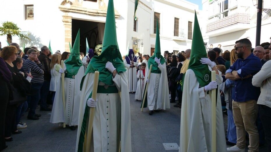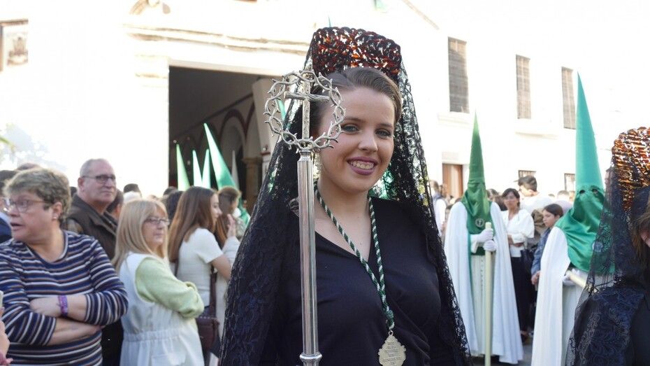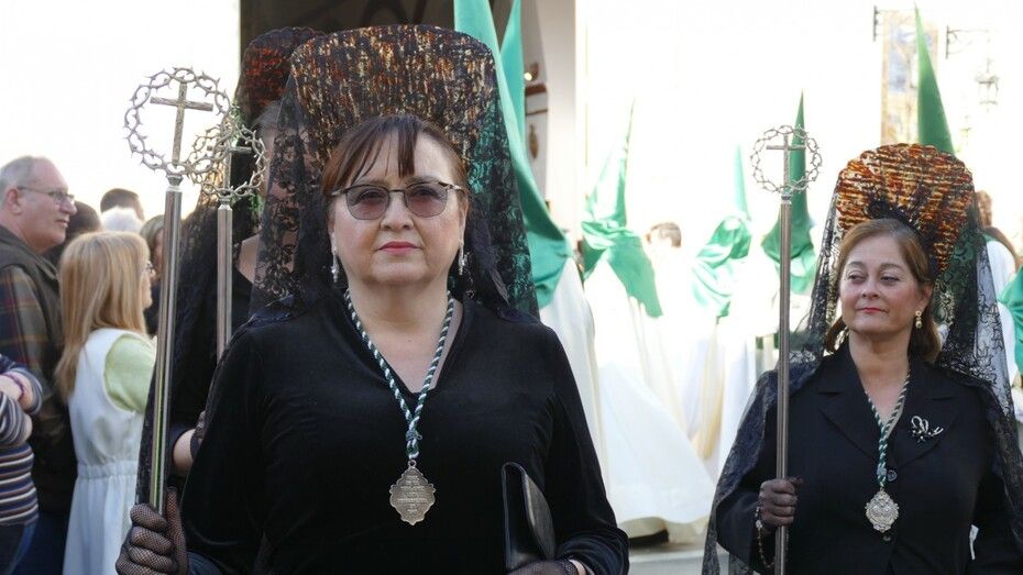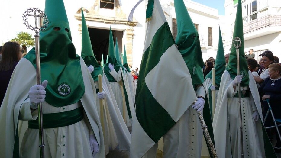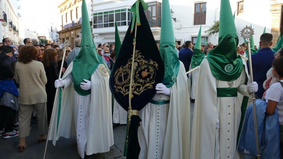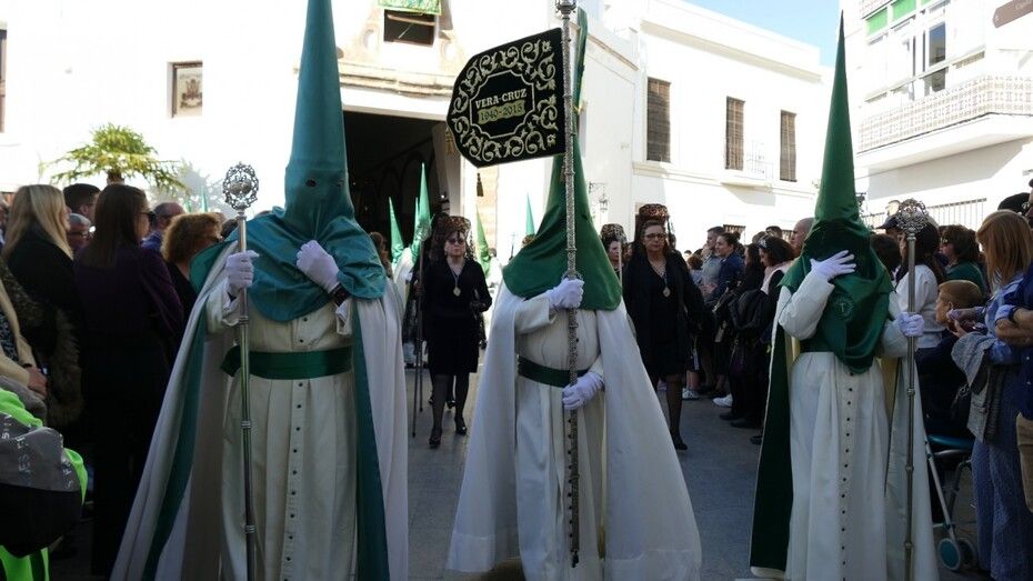 Unos 160 hermanos vestidos con túnica y capa blanca y antifaz verde han formado parte de un cortejo en el que también ha habido una representación de mujeres de mantilla y un pequeño grupo de niños como cantera de la cofradía veracrucista. Además, ha habido hermanos del Martes Santo del que también se encarga esta cofradía, y un hermano del Santo Entierro con quien han venido coincidiendo estos años en sus salidas procesionales. En primer lugar, se ha podido ver al Cristo crucificado, una talla del siglo XVIII, de las más antigua de las que procesionan en Rota, que aparece en la cruz; y posteriormente, a su madre, María Santísima de las Angustias bajo palio. Los capataces se han afanado en lucirse como protagonistas del Viernes Santo en cada punto del recorrido.