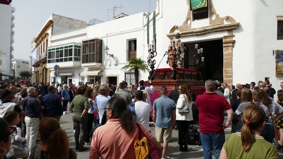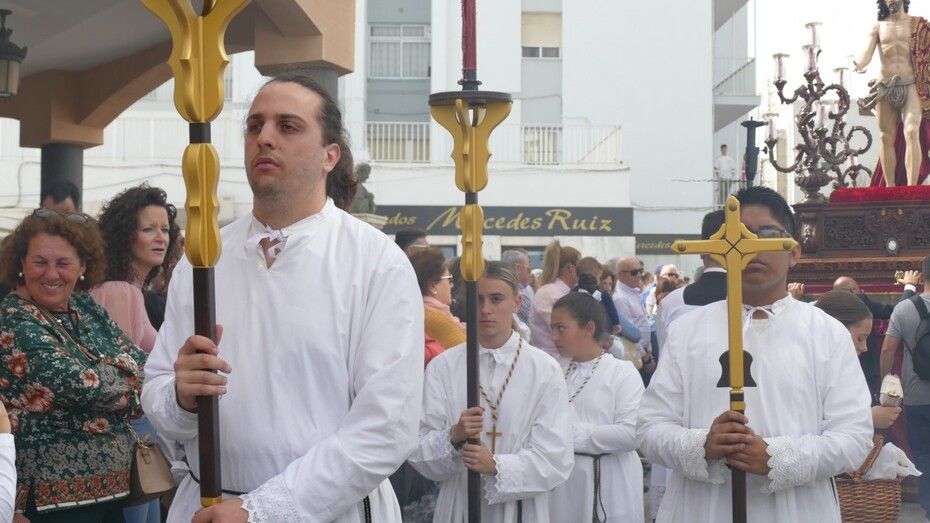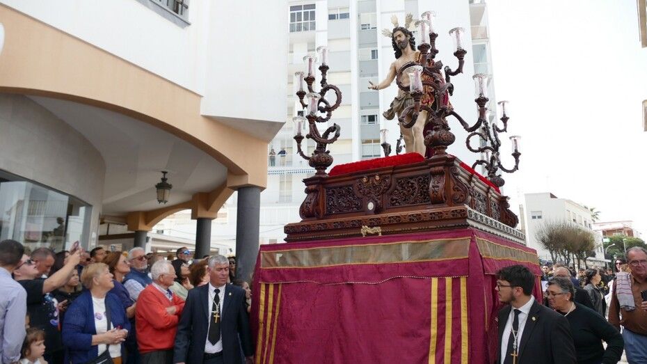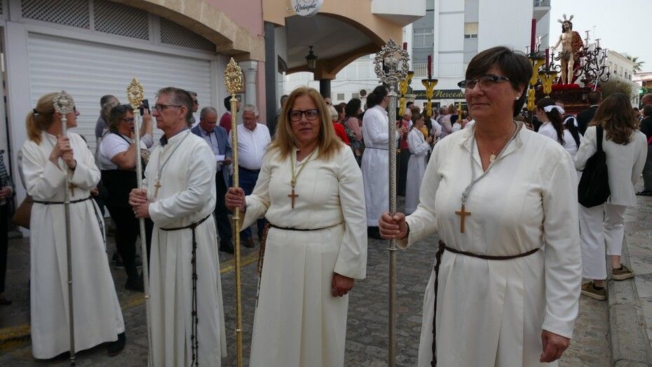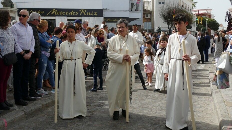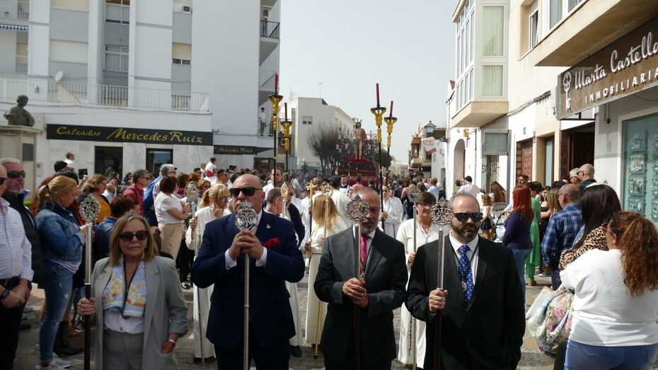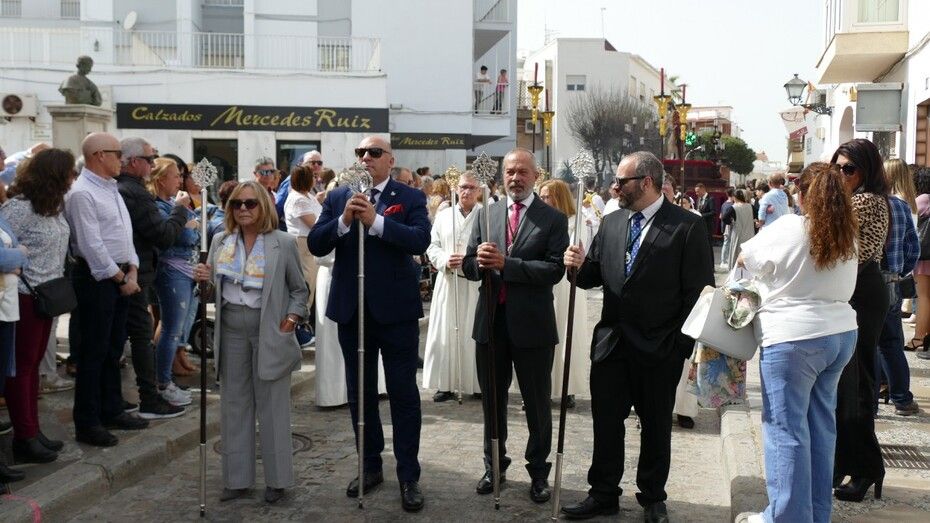 El cambio ha tenido algunas ventajas, como que los cargadores del Santísimo Cristo del Amor y las cargadoras de Nuestra Señora de la Esperanza del Calvario, que se han ido turnando a lo largo del recorrido, no hayan tenido que soportar las temperaturas altas que suelen acompañar a este día y que suponen una dificultad añadida al esfuerzo físico que realizan. Ese, de hecho, era el motivo principal del cambio de hora, evitar algún desmayo como ocurría el año pasado en el seno de la cuadrilla, aunque conllevaba la duda de saber qué acogida tendría en la calle. Varios factores se mostraban en contra ante esta modificación: el cansancio acumulado de una Semana Santa intensa, que el grueso de turistas ya se ha marchado y que al día siguiente es laborable y además se reanudan las clases, lo que obliga a muchos estudiantes universitarios a marcharse y a los más pequeños a acostarse antes. Pero al final, los roteños han acompañado a Jesús Resucitado y en la salida, a las cuatro y media de la tarde, la calle María Auxiliadora se mostraba concurrida. Así lo ha he estado toda la zona centro, sin aglomeraciones y muy lejos de bullicio en la calle, pero arropado.