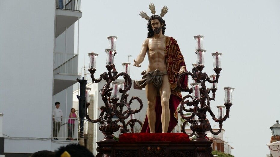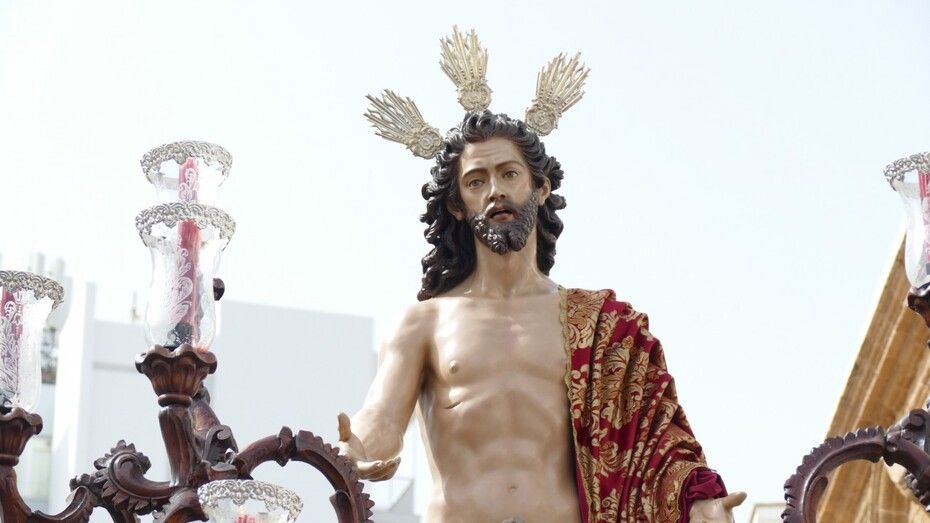 Jesús Resucitado, que ha ido al son de las marchas interpretadas por la a Banda de Cornetas "Alfonso X El Sabio" de El Puerto de Santa María, ha estrenado un sudario rojo bordado que le ha dado un aire diferente en una tarde de Domingo de Resurrección que también lo ha sido. Era igualmente una novedad que Jesús procesionara el en paso del cristo del Amor y por tanto, las cargadoras y costaleros lo hicieran por dentro del paso en vez de por fuera como era habitual verlo.