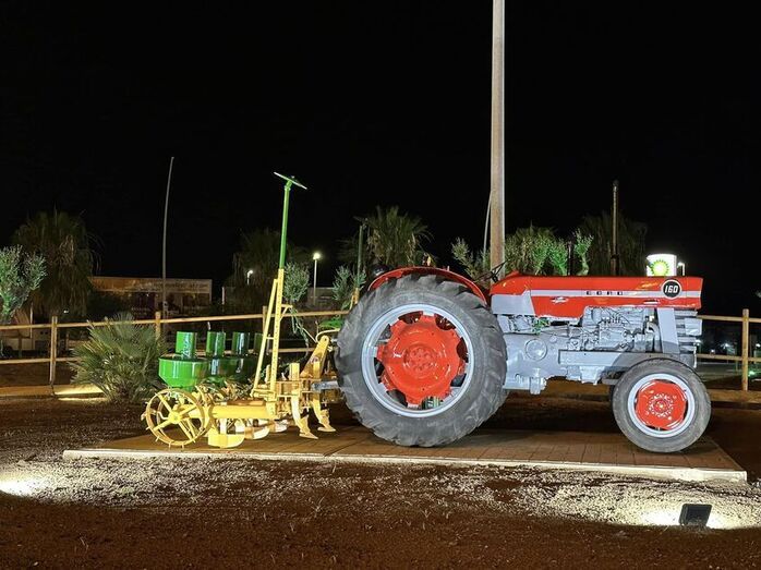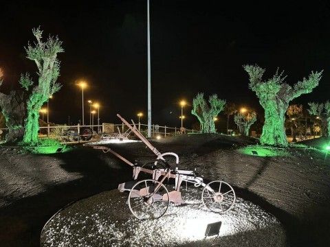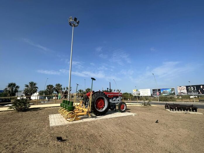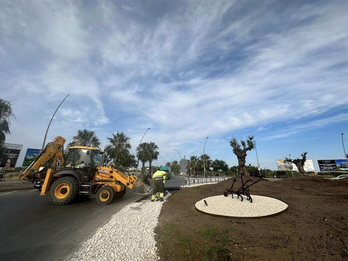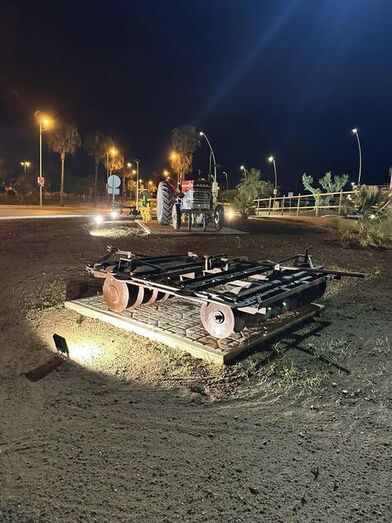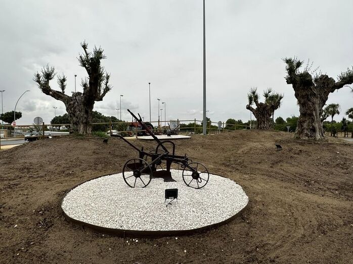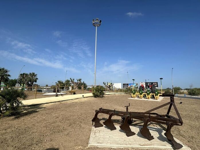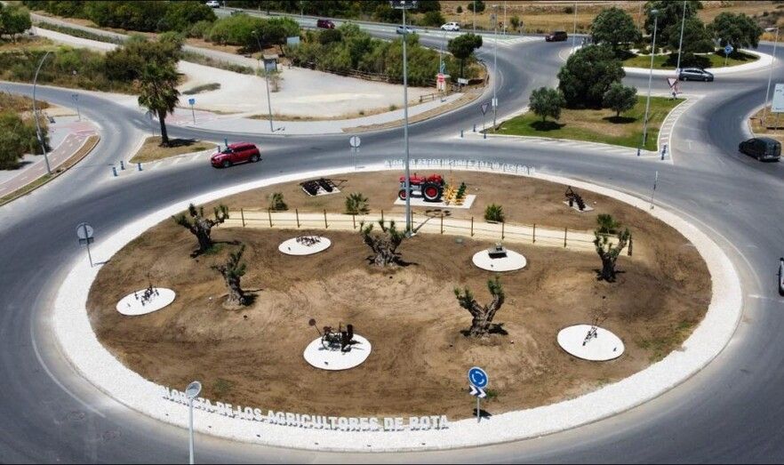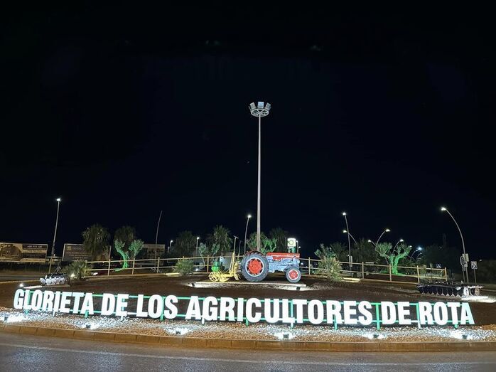 Anoche quedó totalmente terminada e iluminada, y hoy ya se puede leer el gran rótulo que indica "Glorieta de los agricultores de Rota". Está situada casi a la salida de la localidad, junto a la rotonda "Villa de Rota", y es intersección entre el Camino Santa Teresa, los nuevos suelos y la avenida de la Libertad. Como decoración, se han elegido motivos que tienen que ver con el campo, como un tractor y varios aperos de labranza que se han colocado en esta glorieta de grandes dimensiones, además de algunos olivos.