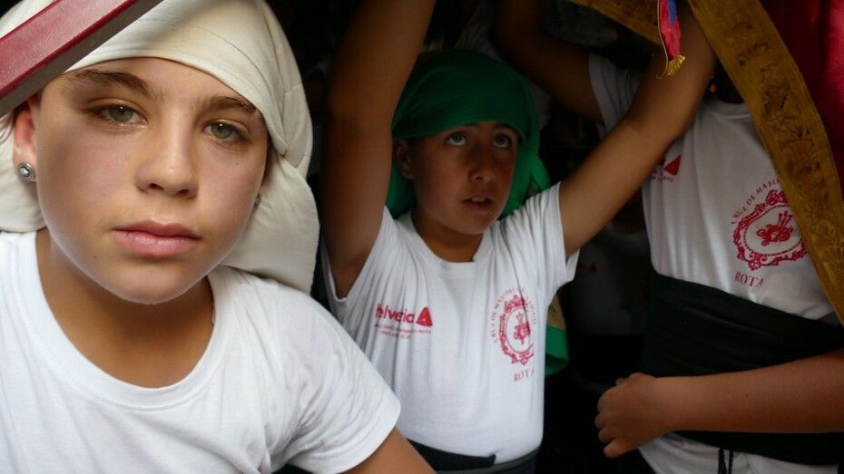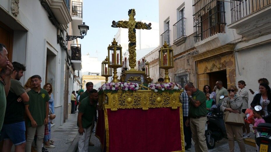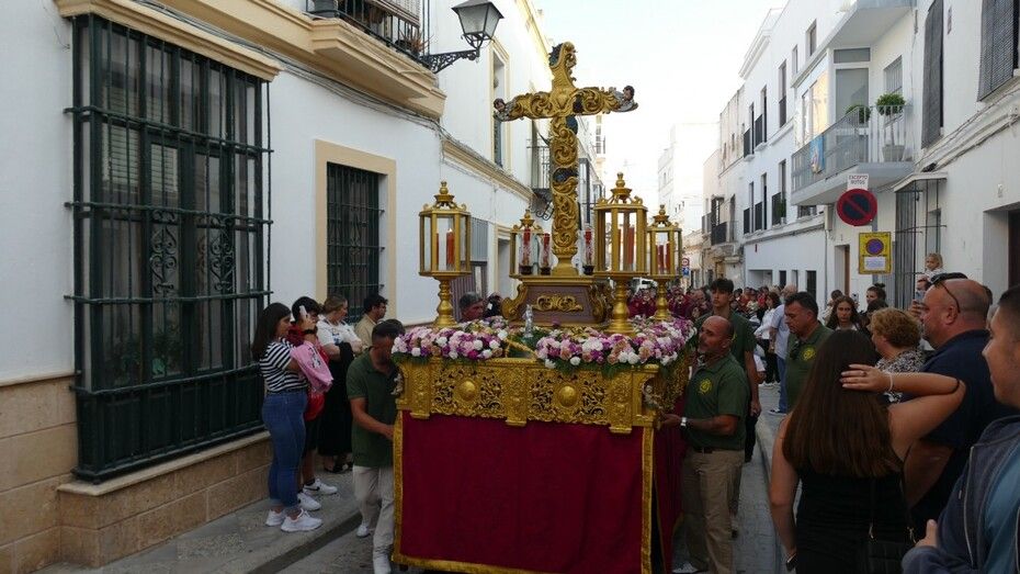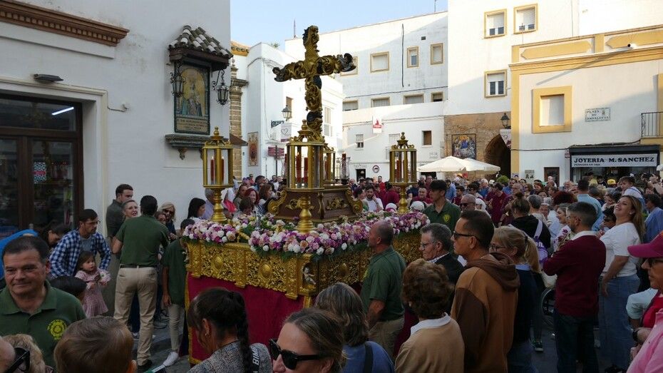 A las ocho de la tarde han partido desde la capilla de la Caridad, con una plaza de Andalucía en la que se podía ver bastante público, movido en parte, por la curiosidad que suscita este paso llevado por niños de entre 8 y 12 años que se toman muy en serio el papel de costaleros. Lo hacían también los capataces Manuel Moreno Heredia y Rodrigo Santamaría Caballero, a los que se unía este año el benjamín Ismael Morales Niño, que han guiado el paso de la gran cruz ornamentada por las calles del casco histórico de Rota.