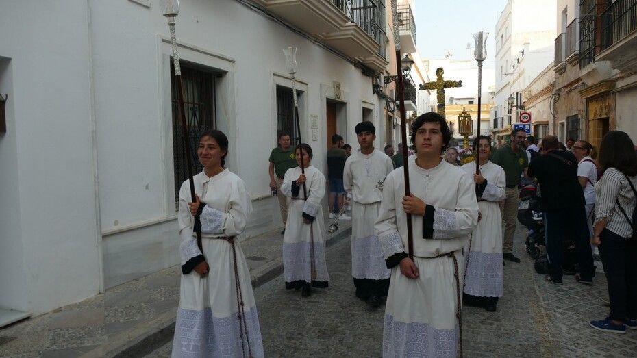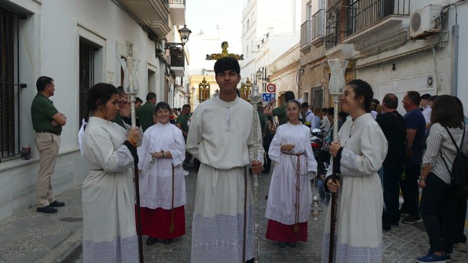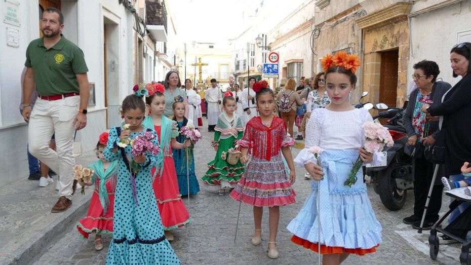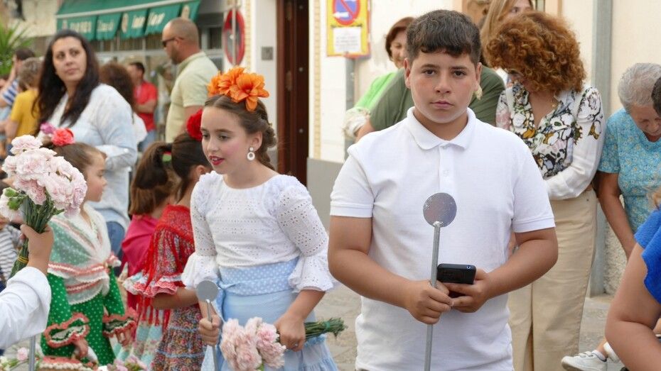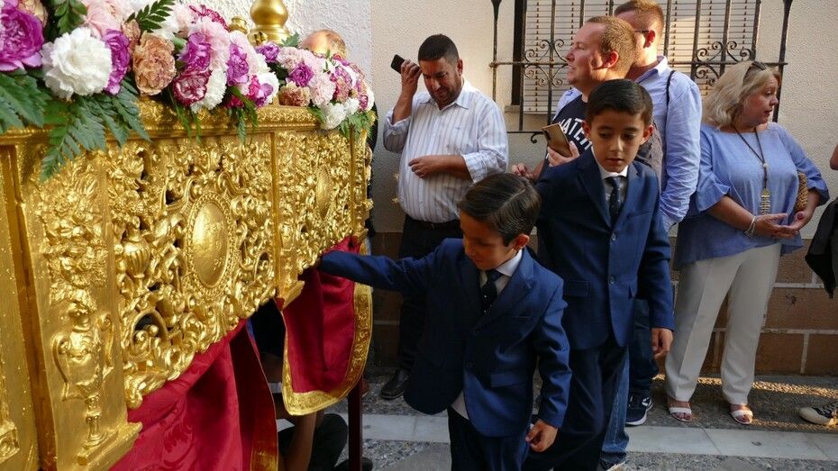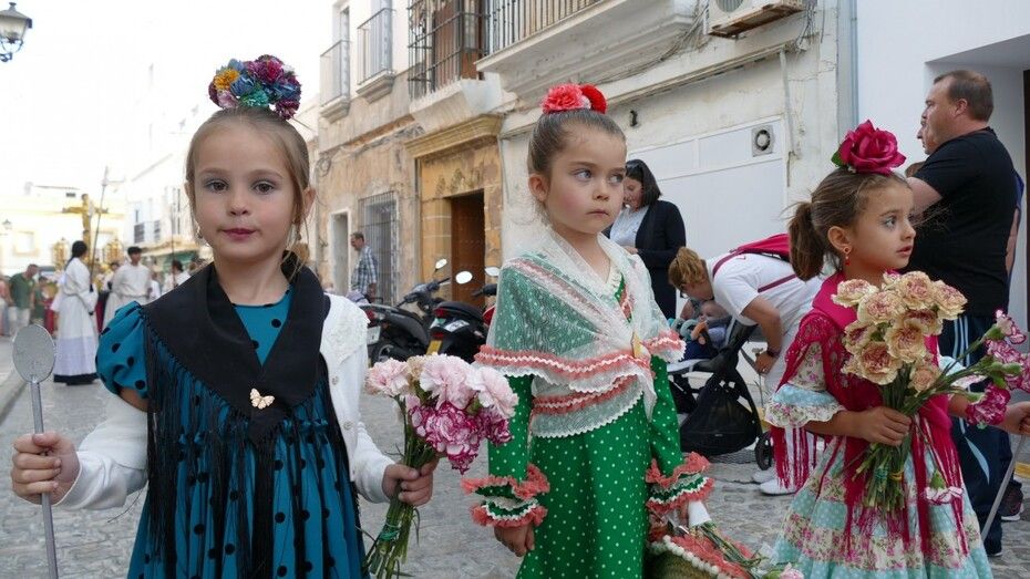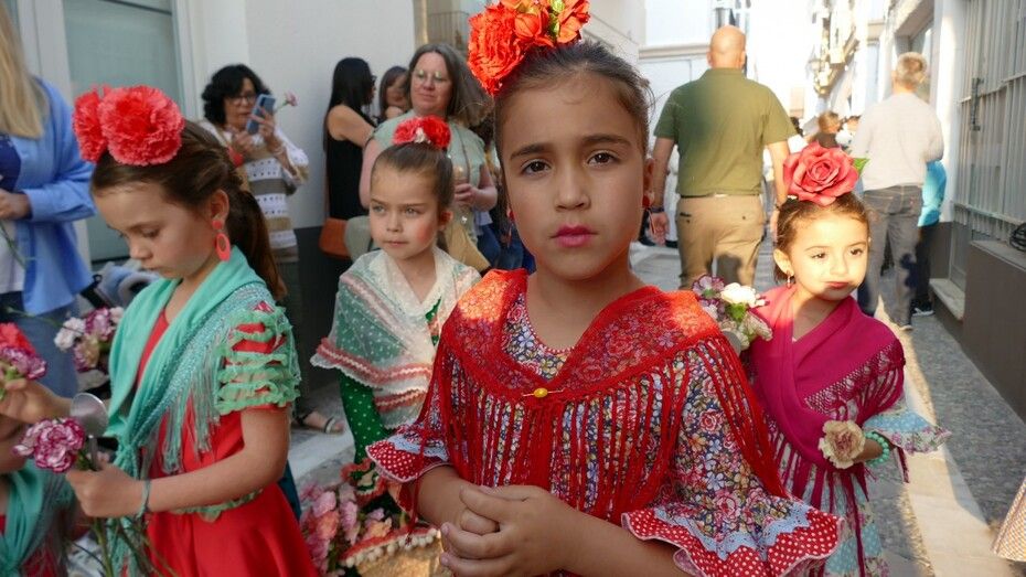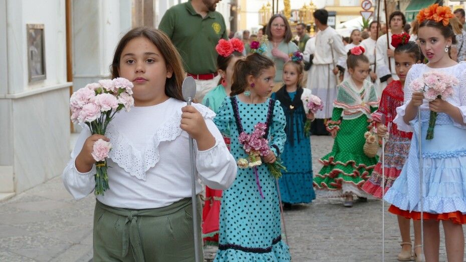 Abrían el cortejo los más pequeños, algunos vestidos de calle y otras de gitana, con flores en las manos o varas y saludando a todo aquel que se fijara en ellos. Le seguía el cuerpo de acólitos precediendo el paso que ha marchado a los acordes musicales que ha tocado la Banda de Cornetas y Tambores de la Asociación Musical Zoilo Ruiz-Mateos.