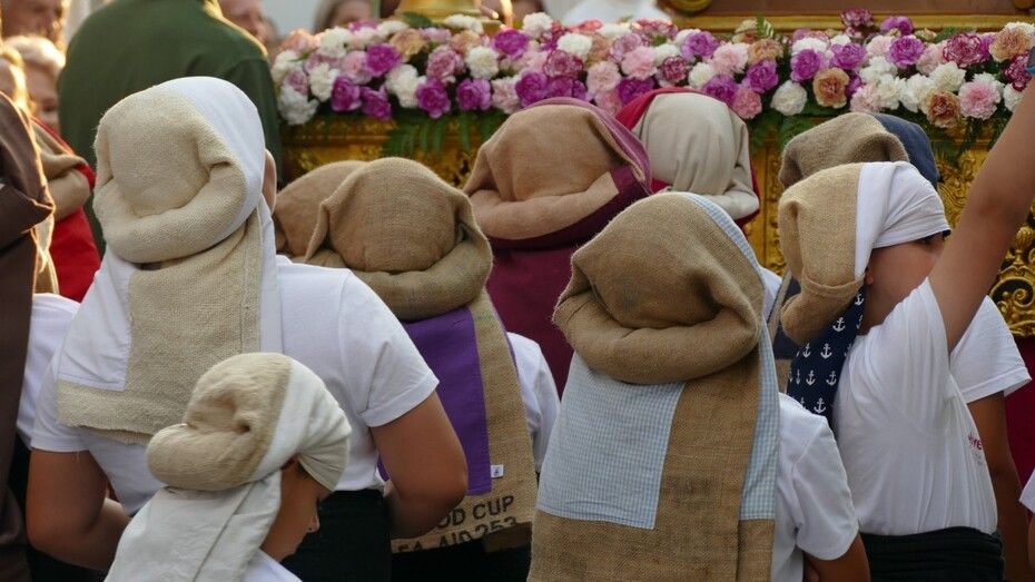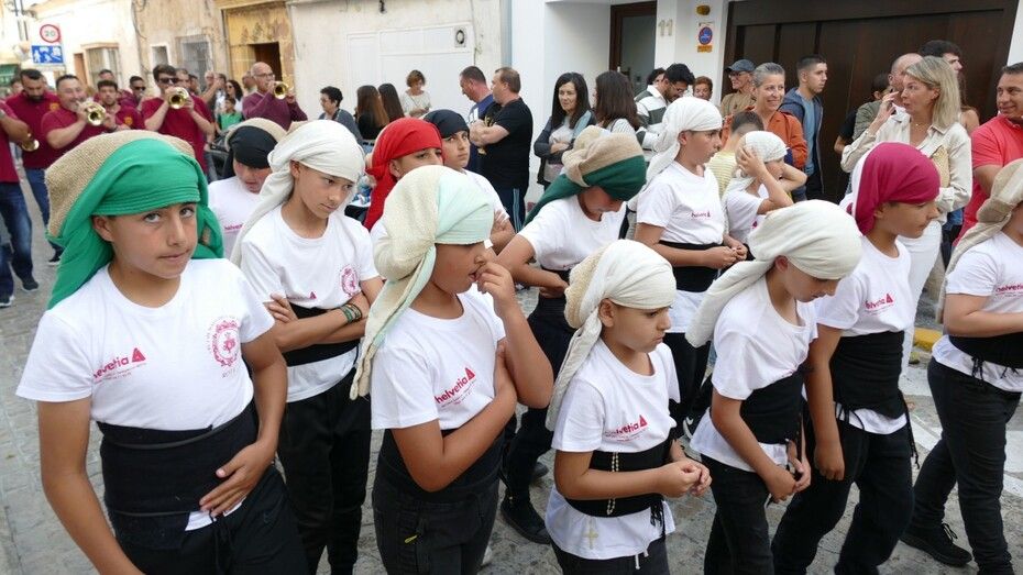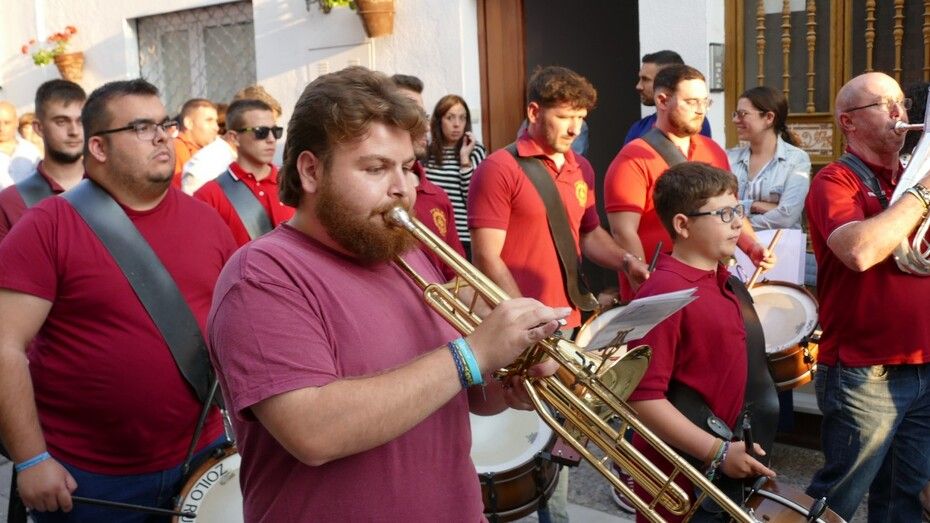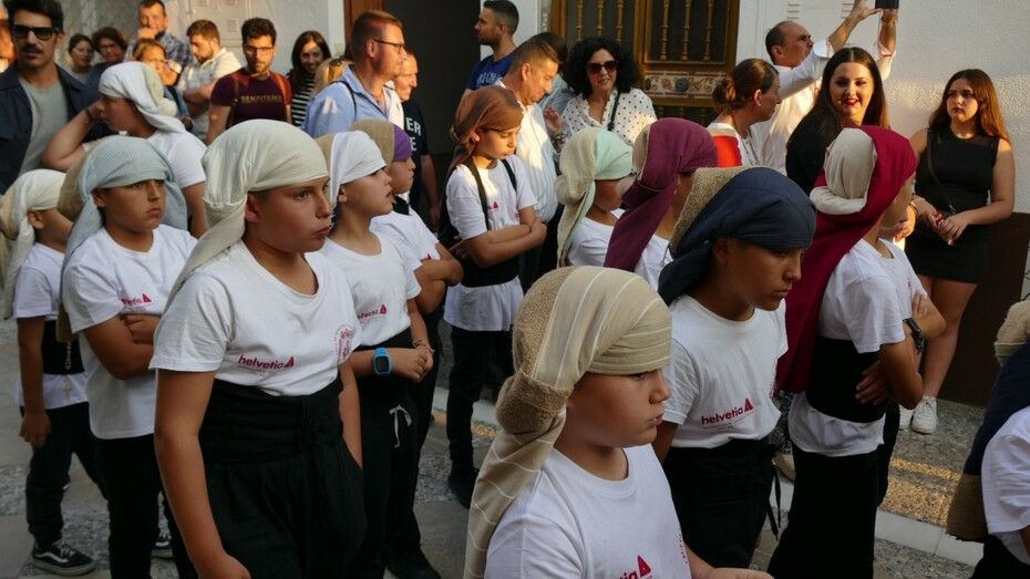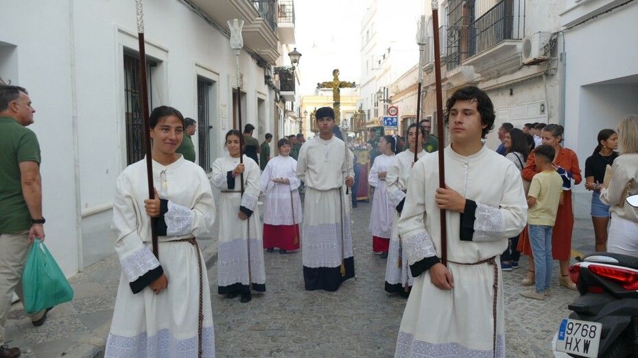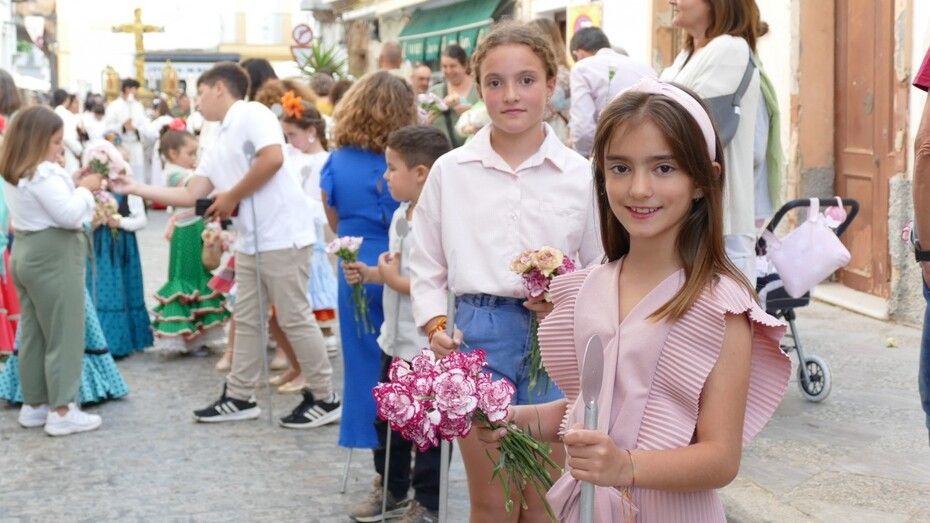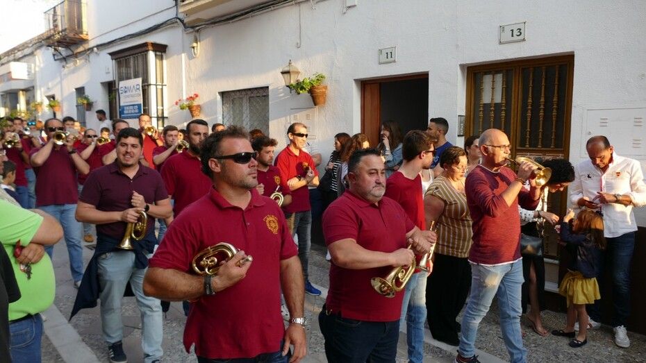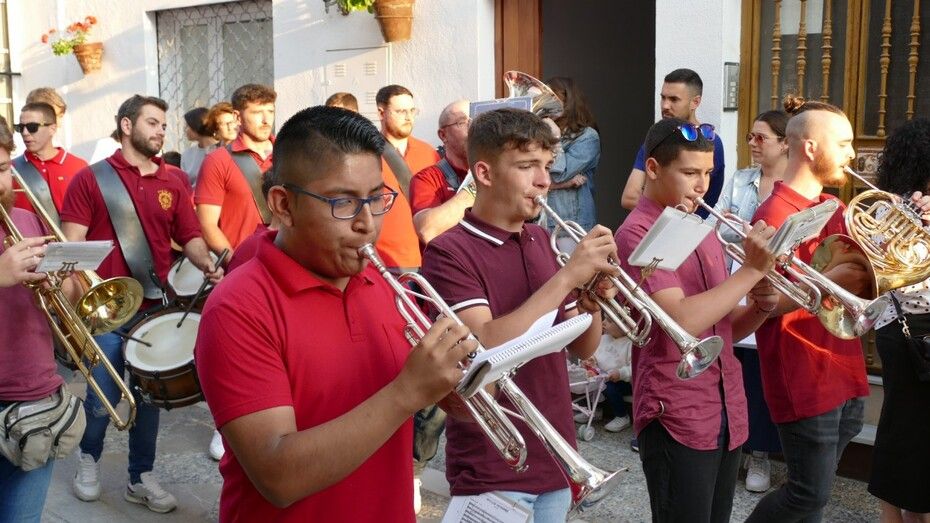 Abrían el cortejo los más pequeños, algunos vestidos de calle y otras de gitana, con flores en las manos o varas y saludando a todo aquel que se fijara en ellos. Le seguía el cuerpo de acólitos precediendo el paso que ha marchado a los acordes musicales que ha tocado la Banda de Cornetas y Tambores de la Asociación Musical Zoilo Ruiz-Mateos.