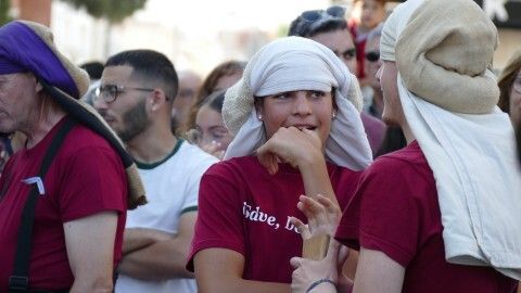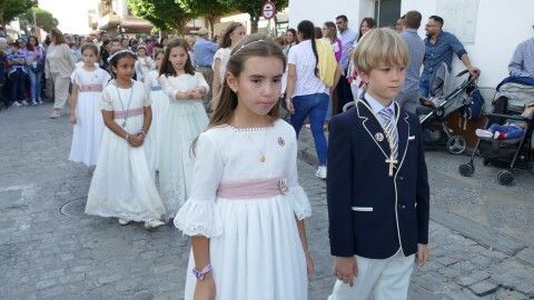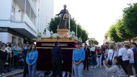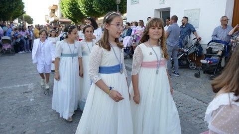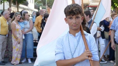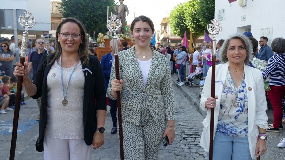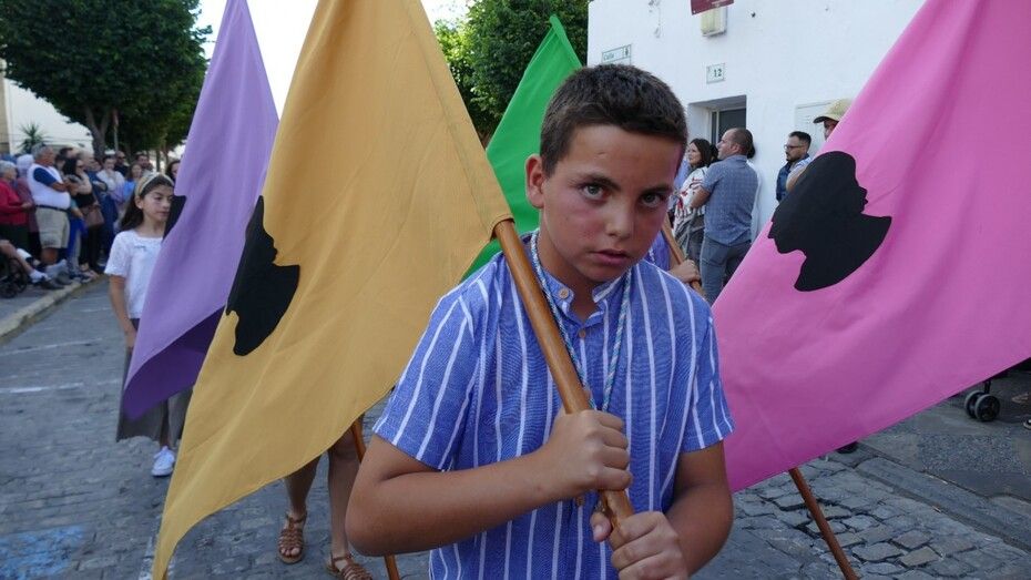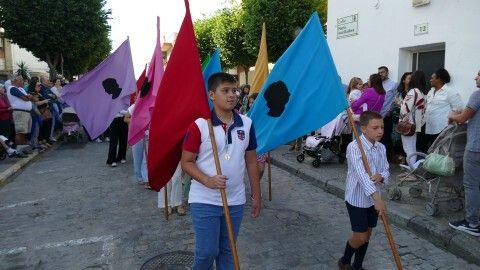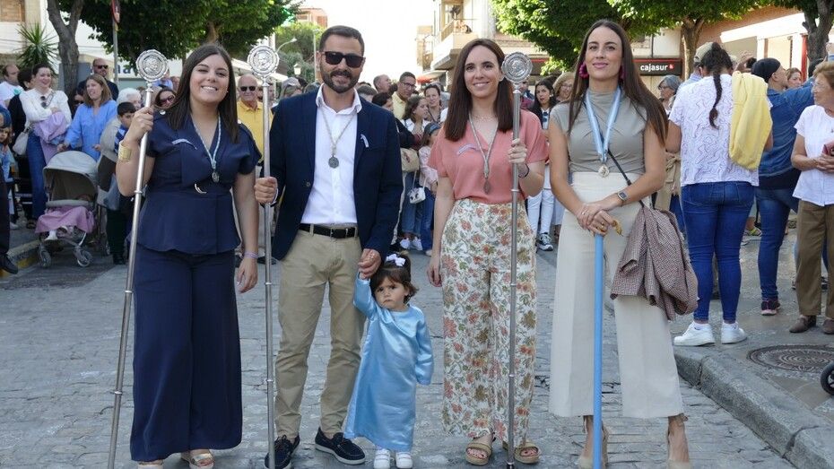 El centro ha estado lleno y especialmente, la procesión se ha lucido en la calle Prim, donde los vecinos suelen decorar con cuelga balcones y banderines rosas y celestes esta vía para que luzca el paso de la virgen.