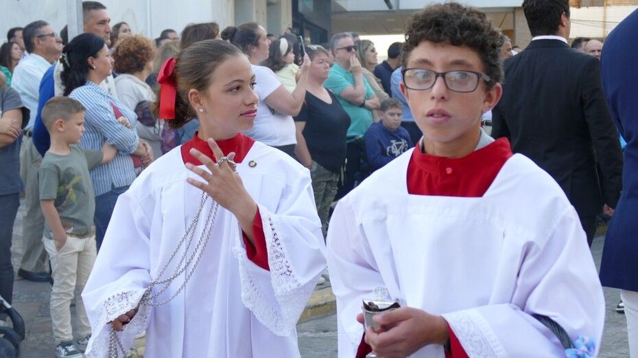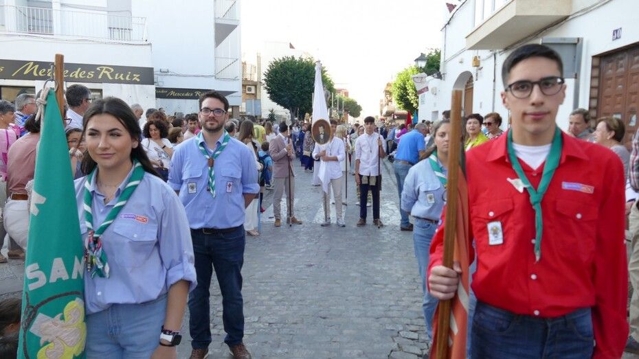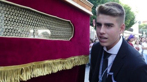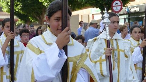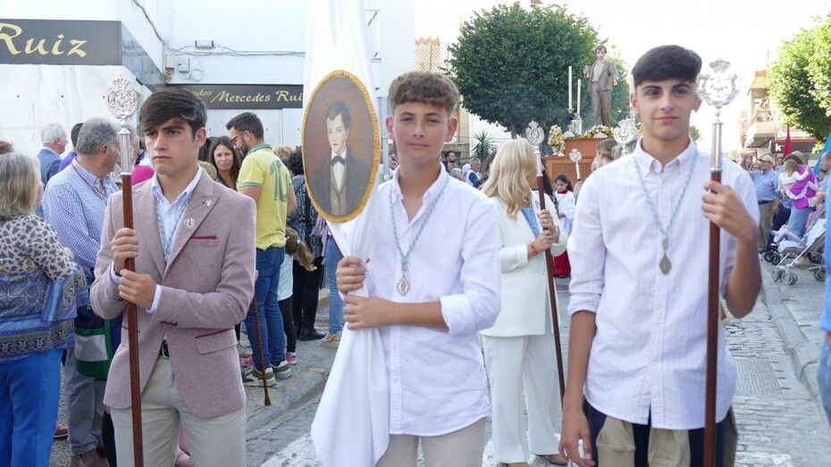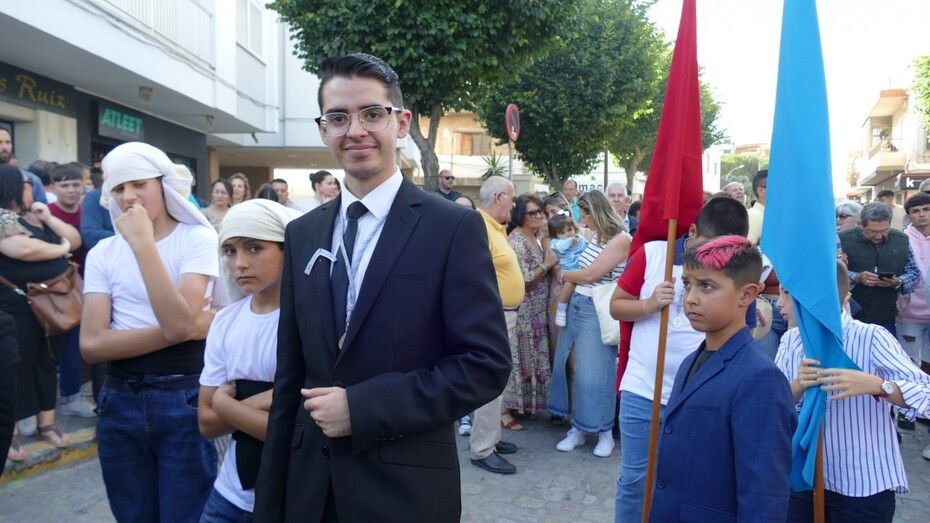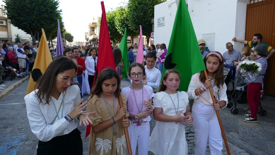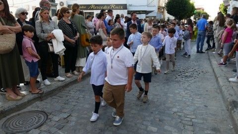 Abrían paso los pequeños angelitos del ciclo de Infantil que suelen atrapar muchas miradas y que junto a los alumnos del segundo ciclo vestidos de calle y las niñas de mantilla son sin duda, los que más revoltosos andan en la comitiva y los que dejan la espontaneidad propia de la edad al descubierto. Le seguían jóvenes alumnos portando las banderas de la comunidad salesiana, los niños y niñas que este año han recibido su Primera Comunión, antiguos alumnos con varas, las asociaciones de María Auxiliadora, tanto el ADMA de Salesianos como el ADMA de Salesianas y mujeres luciendo la mantilla española. Los seises y una amplia representación del grupo de Scouts "Santo Domingo Savio", además de representación del propio centro y de las Salesianas, han formado el amplio cortejo de casi 200 personas.