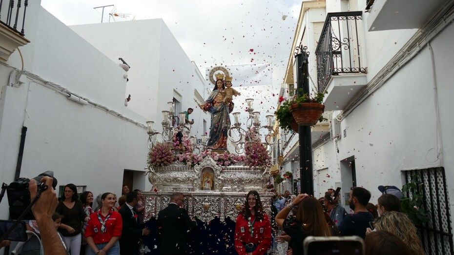 Como ya es habitual, en un punto de esta calle, también se han podido escuchar sevillanas dedicadas en su honor y más adelante, una gran petalada que hace que María Auxiliadora se convierta en la reina del mes de las flores.