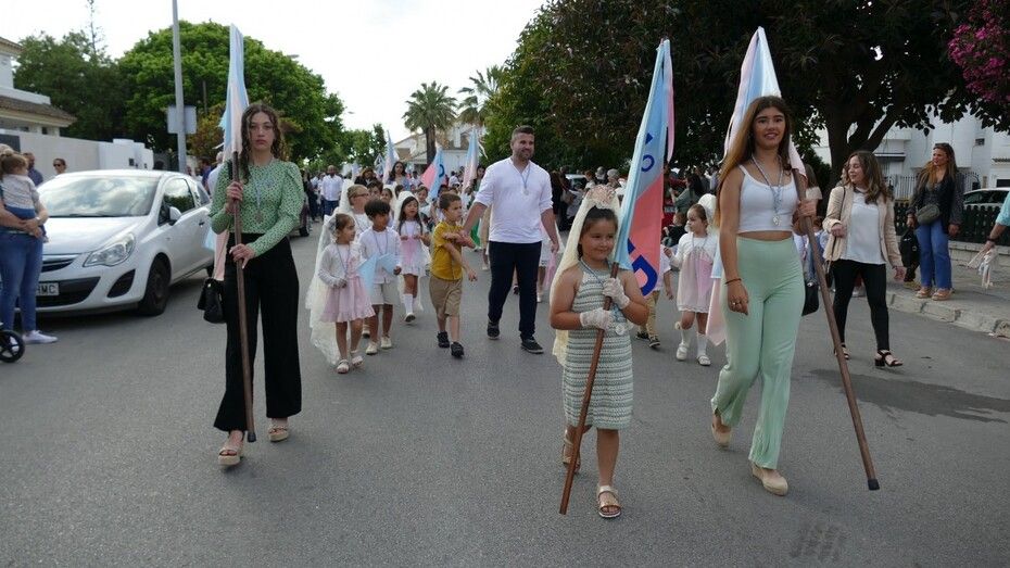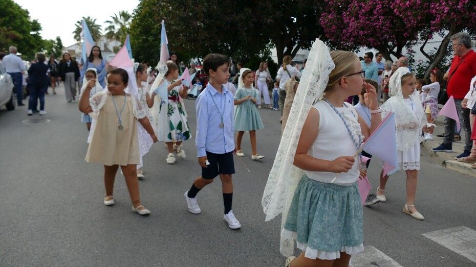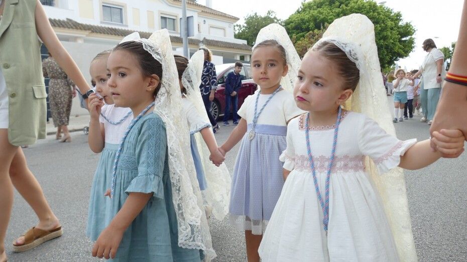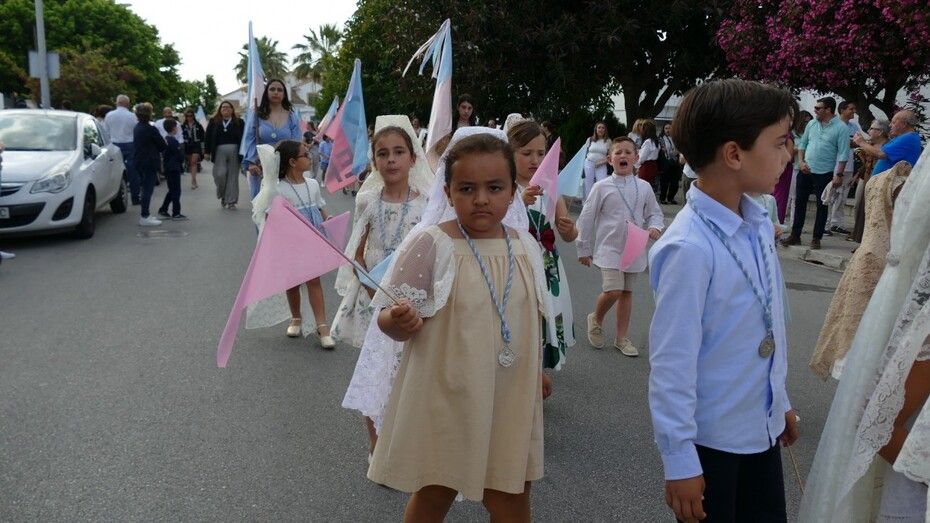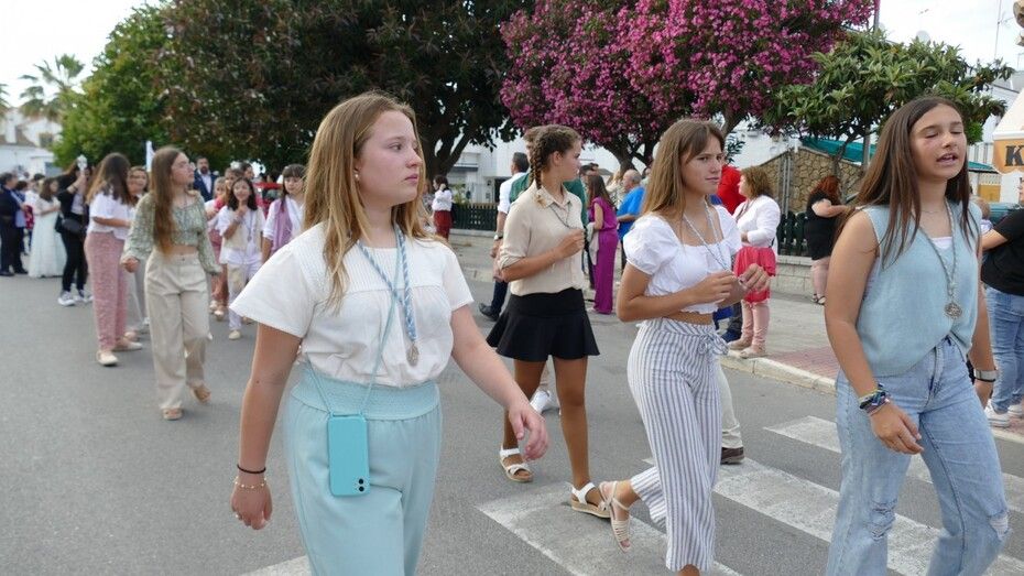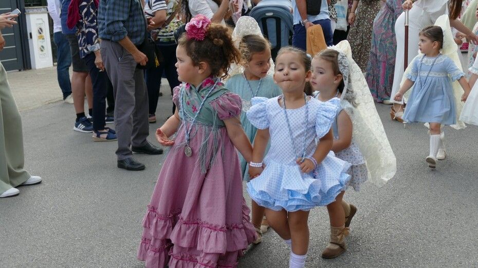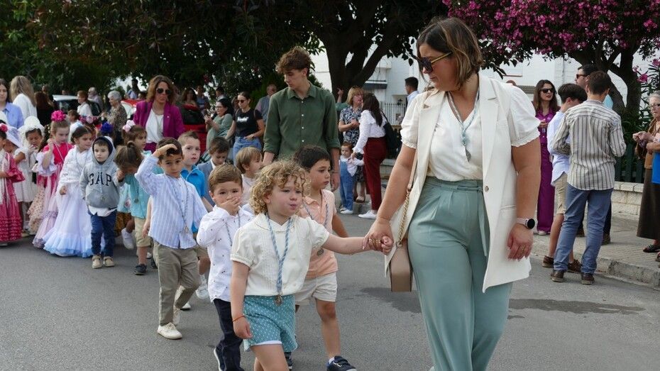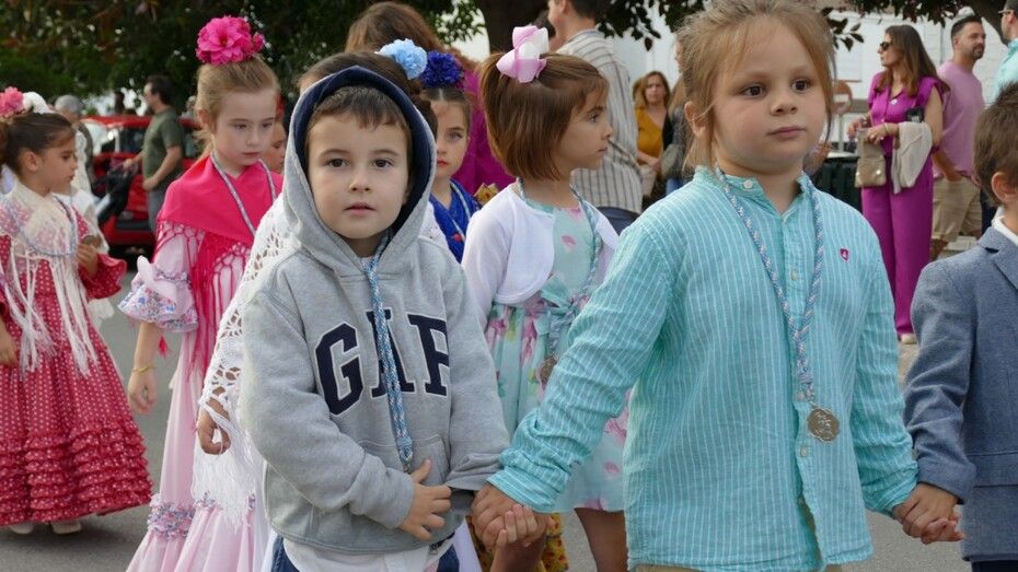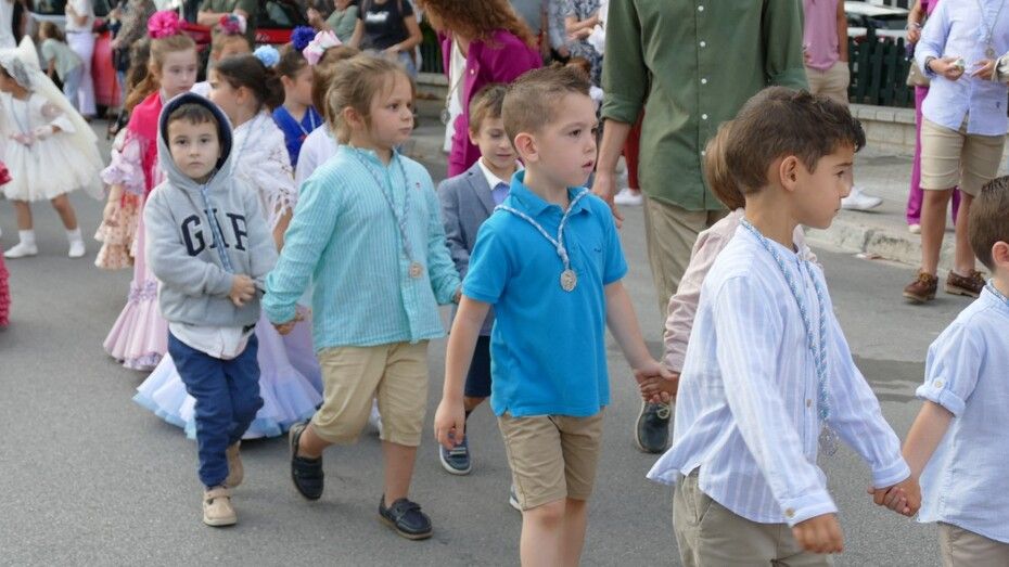 A las siete de la tarde partía el cortejo amplio desde el colegio, y ya eran muchos los vecinos de la zona y padres de alumnos, los que esperaban a pie de calle para ver el discurrir de una comitiva en la que además de los pequeños y adolescentes vestidos de calle, se ha podido ver algunas niñas vestidas de mantilla o flamenca.