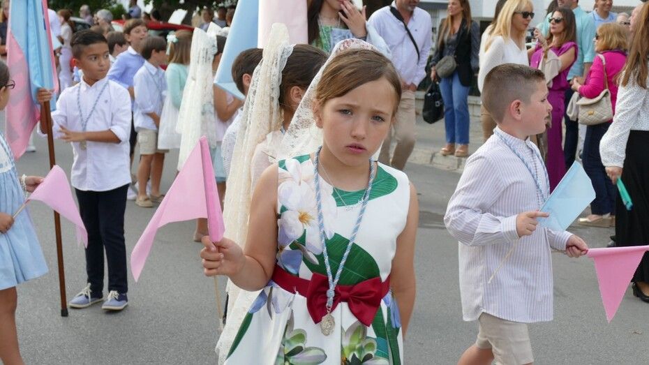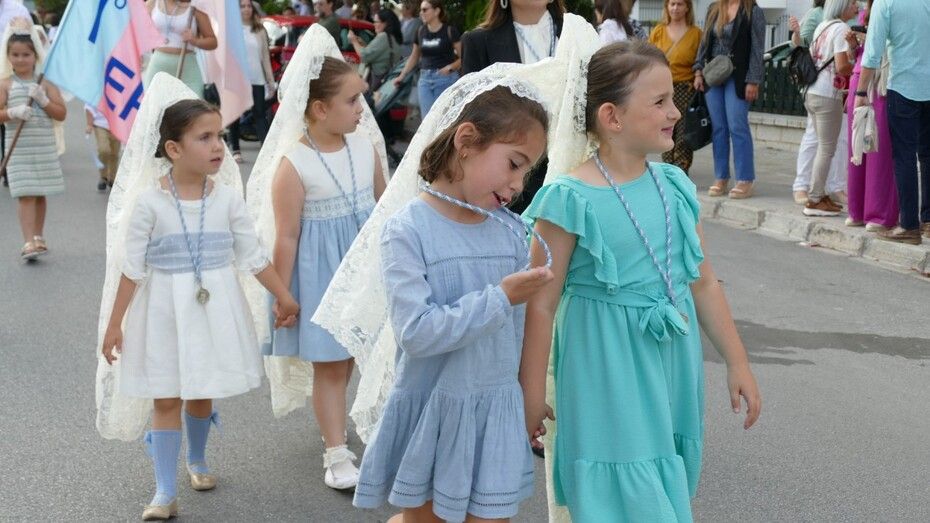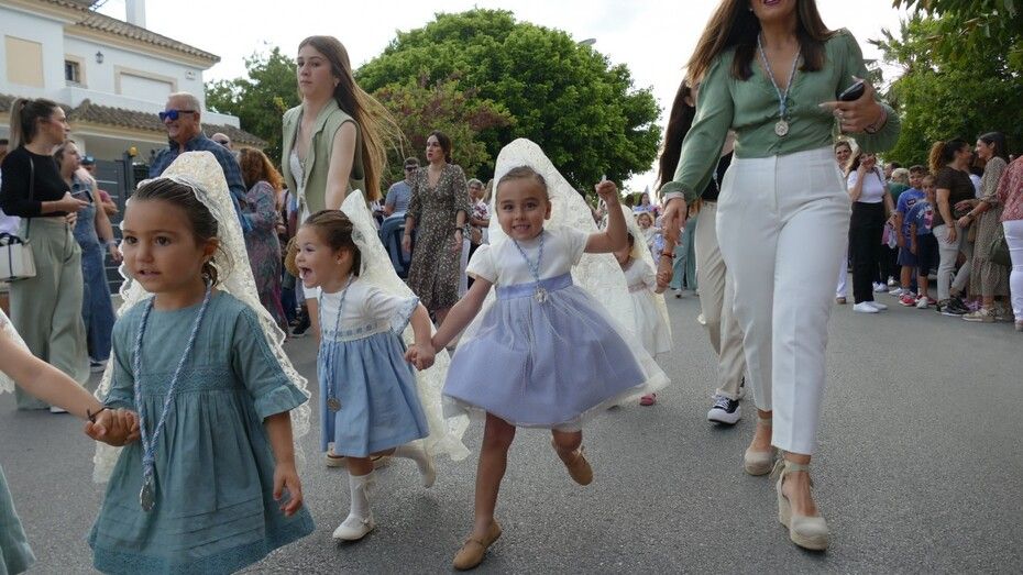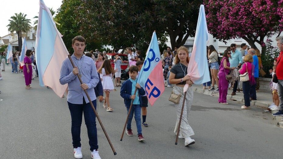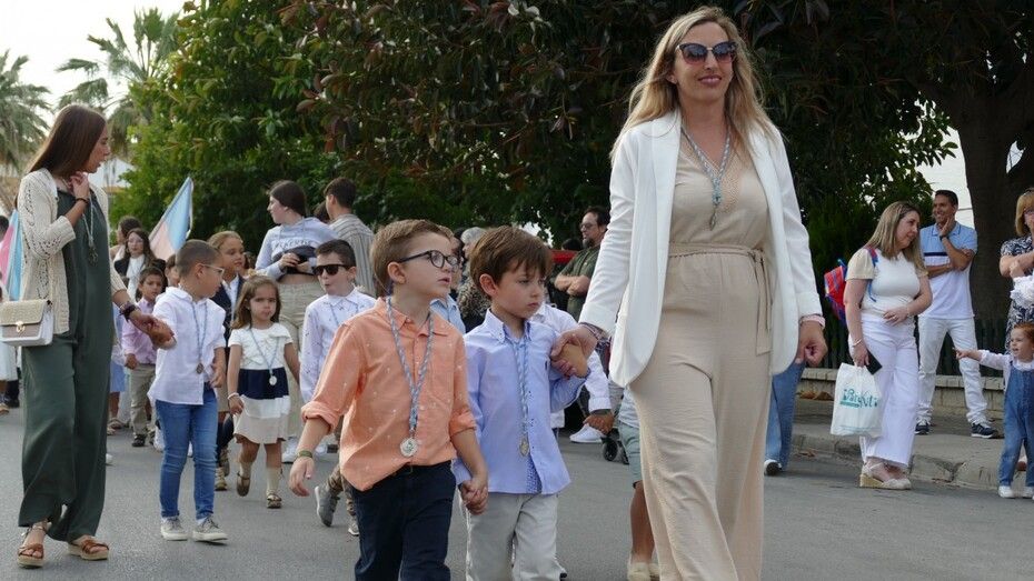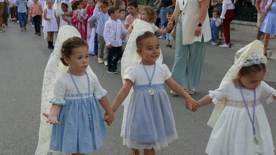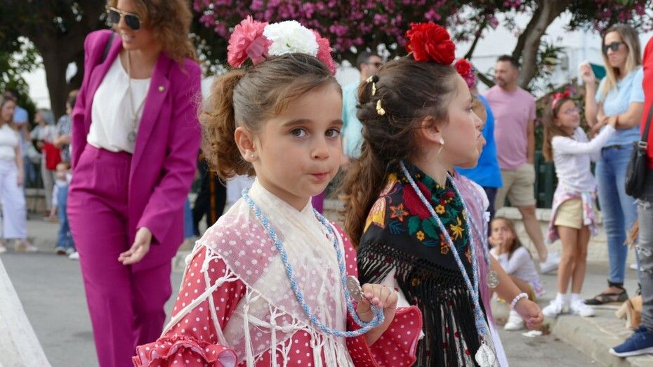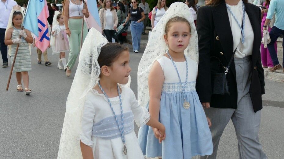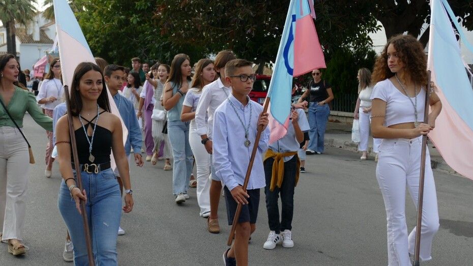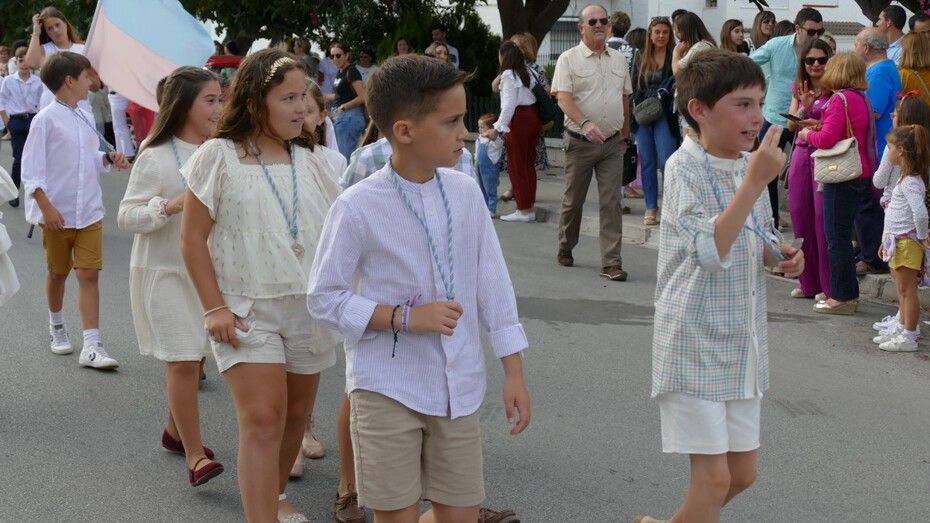 A las siete de la tarde partía el cortejo amplio desde el colegio, y ya eran muchos los vecinos de la zona y padres de alumnos, los que esperaban a pie de calle para ver el discurrir de una comitiva en la que además de los pequeños y adolescentes vestidos de calle, se ha podido ver algunas niñas vestidas de mantilla o flamenca.