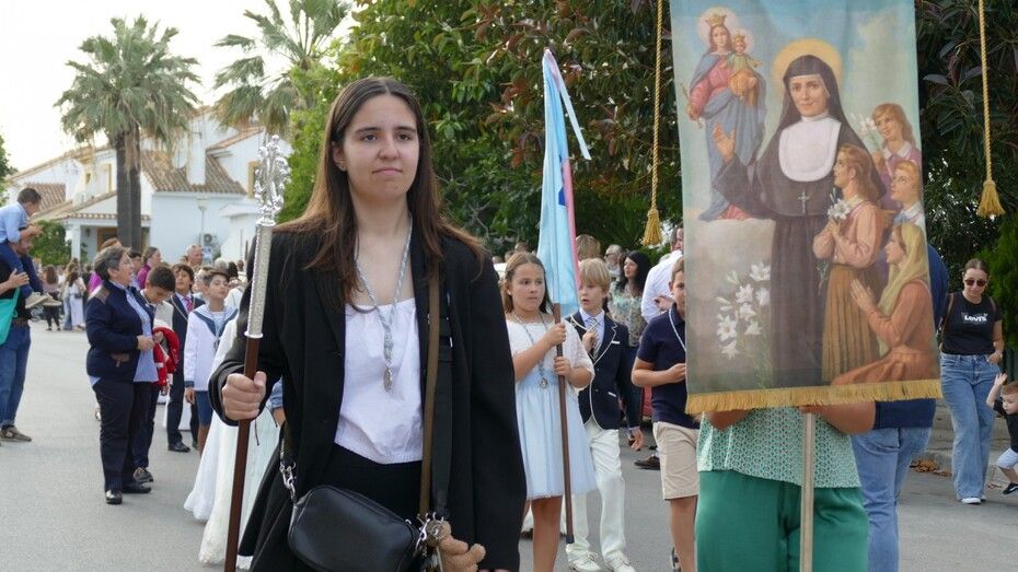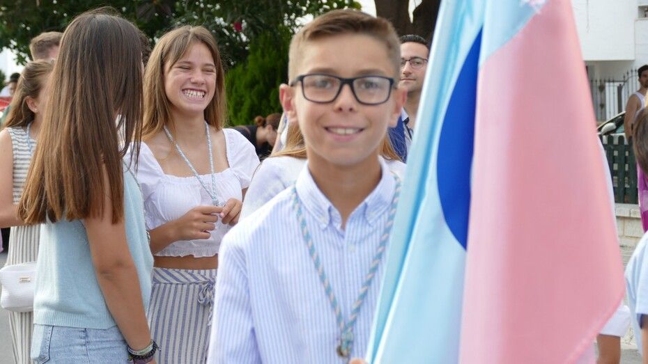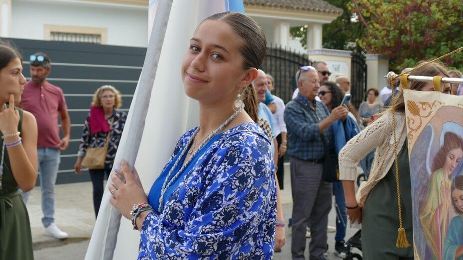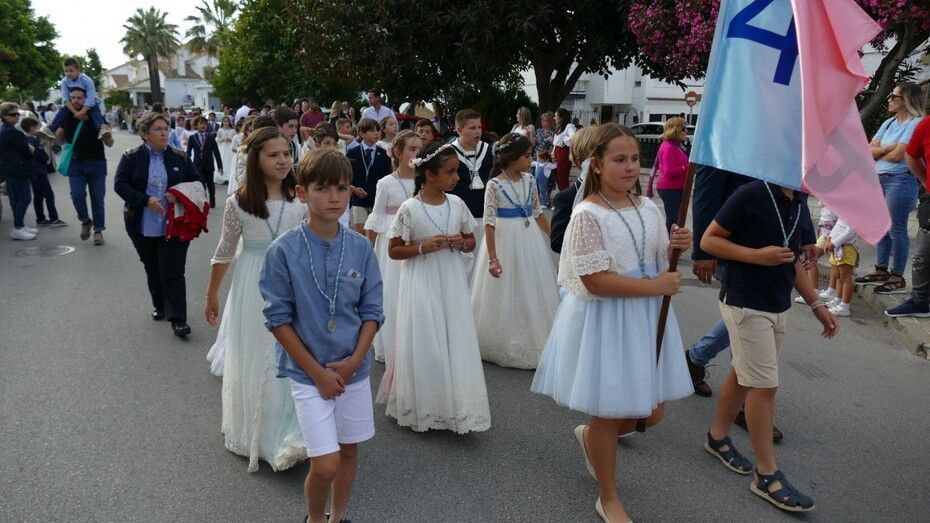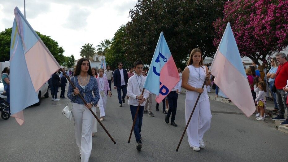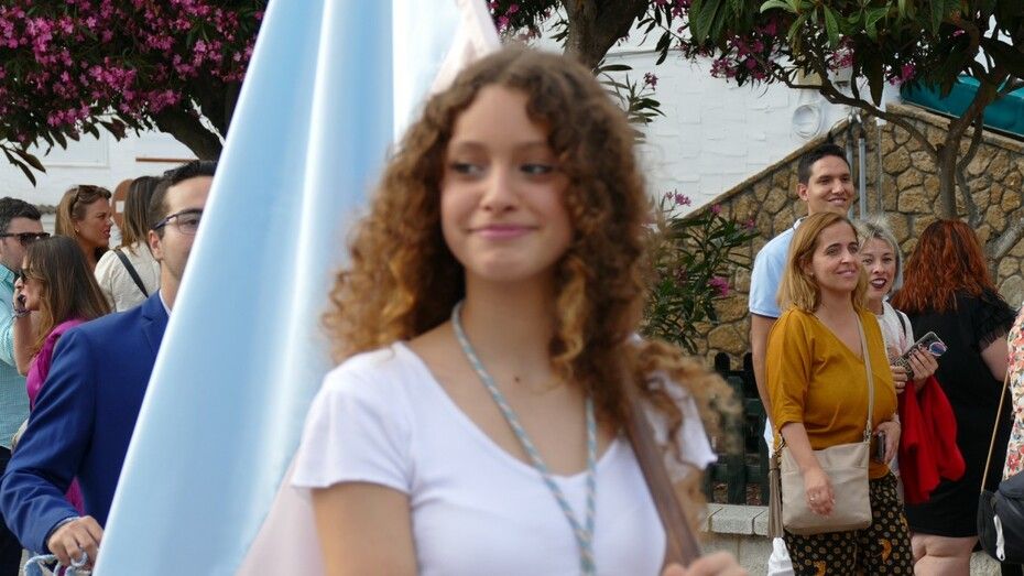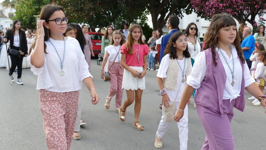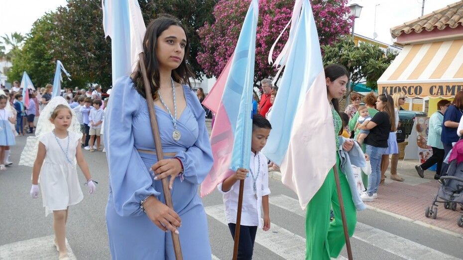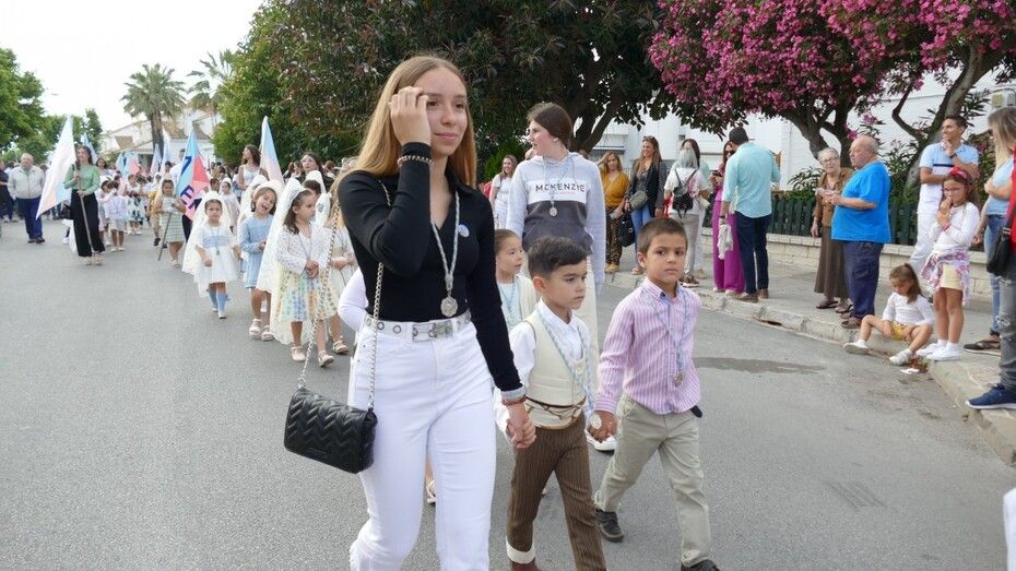 A las siete de la tarde partía el cortejo amplio desde el colegio, y ya eran muchos los vecinos de la zona y padres de alumnos, los que esperaban a pie de calle para ver el discurrir de una comitiva en la que además de los pequeños y adolescentes vestidos de calle, se ha podido ver algunas niñas vestidas de mantilla o flamenca.