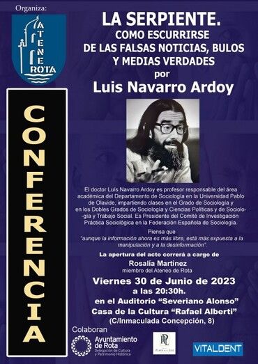 Por último, el viernes 30 de junio, se celebrará la conferencia bajo el título "La serpiente, cómo escurrirse de las falsas noticias, bulos y medias verdades", que llegará de la mano del profesor responsable del Departamento de Sociología de la Universidad de Pablo Olavide, Luis Navarro Ardoy, quien piensa que "aunque la información ahora es más libre, está más expuesta a la manipulación y a la desinformación".