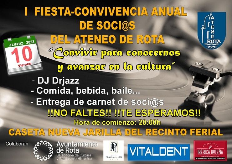 La siguiente actividad del Ateneo será una actividad lúdica, el 10 de junio, con una fiesta-convivencia que será la primera que organicen y que esperan instaurar como cita fija cada año para seguir estrechando lazos entre socios y colaboradores o personas interesadas en avanzar en la cultura. Comenzará a las 20.00 horas, y habrá baile, bebidas y música con el DJ Drjazz. Es una actividad para los socios del Ateneo de Rota pero abierta a quien quiera sumarse para conocer esta entidad cultural local.