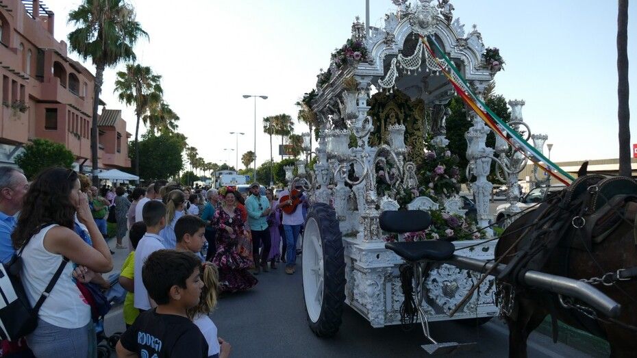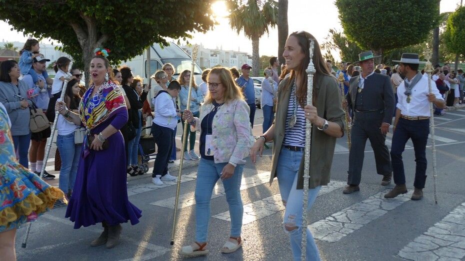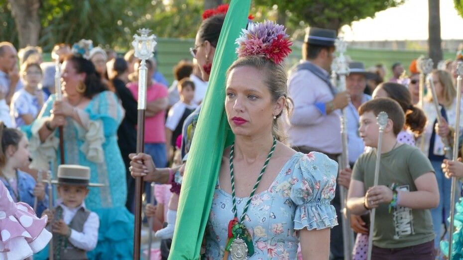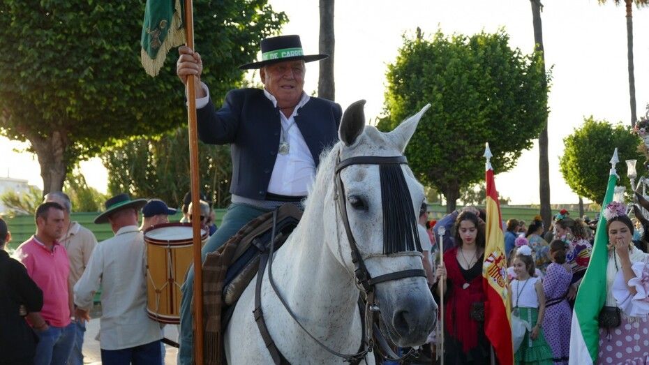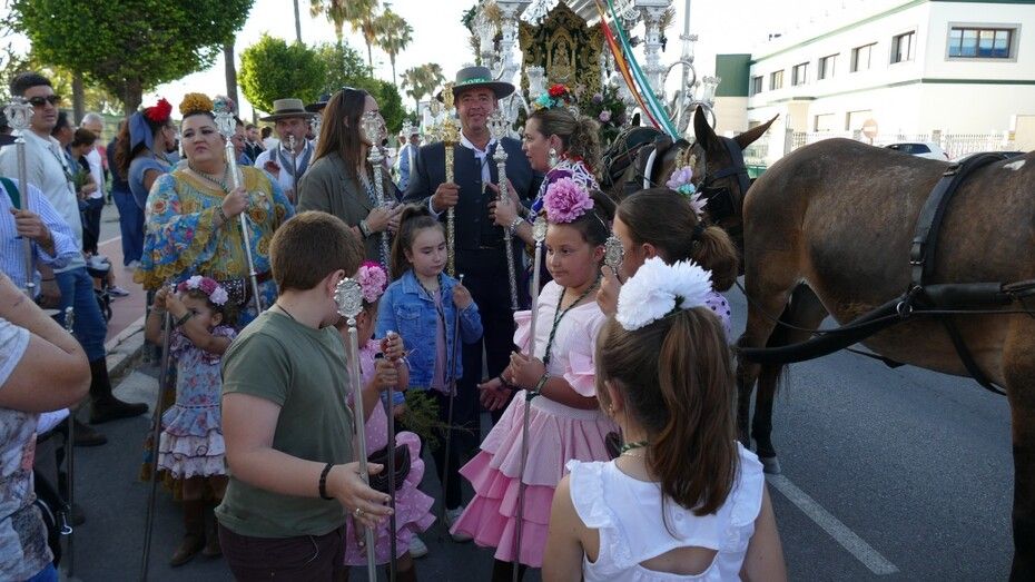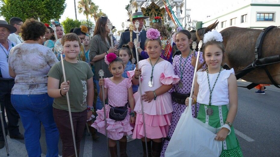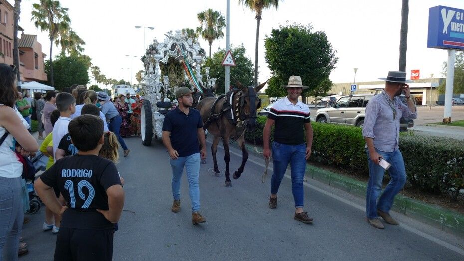 Tres caballos abriendo paso, las banderas portadas por mujeres y una decena de niños como muestra de la cantera que tiene la hermandad, además de miembros de la junta de gobierno, han precedido a la carreta blanca y de plata engalanada para esta entrada y su recta final antes de que empiece su desmontaje hasta el año que viene.