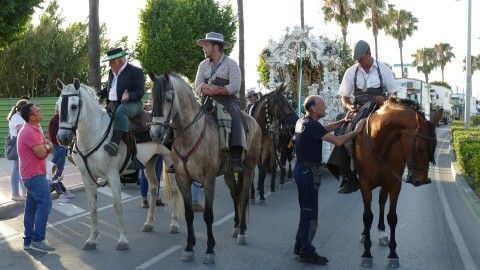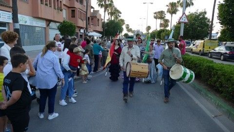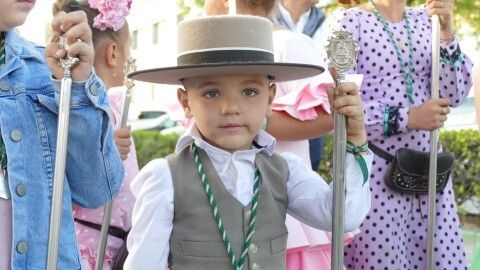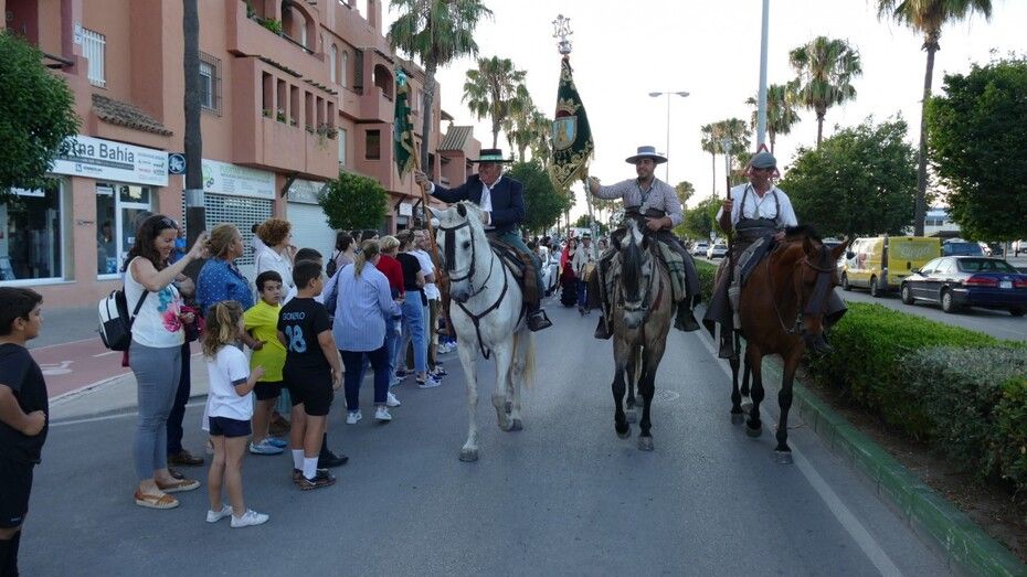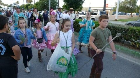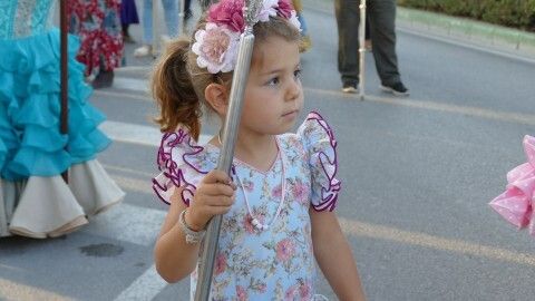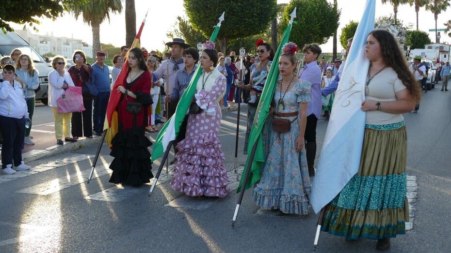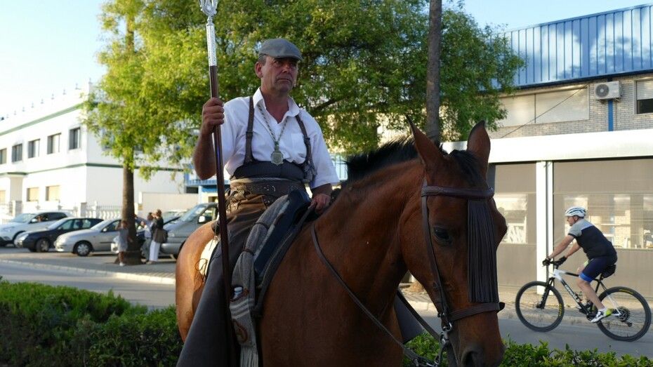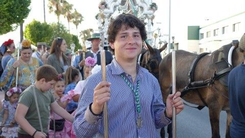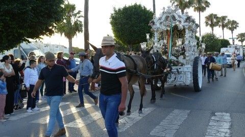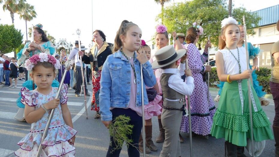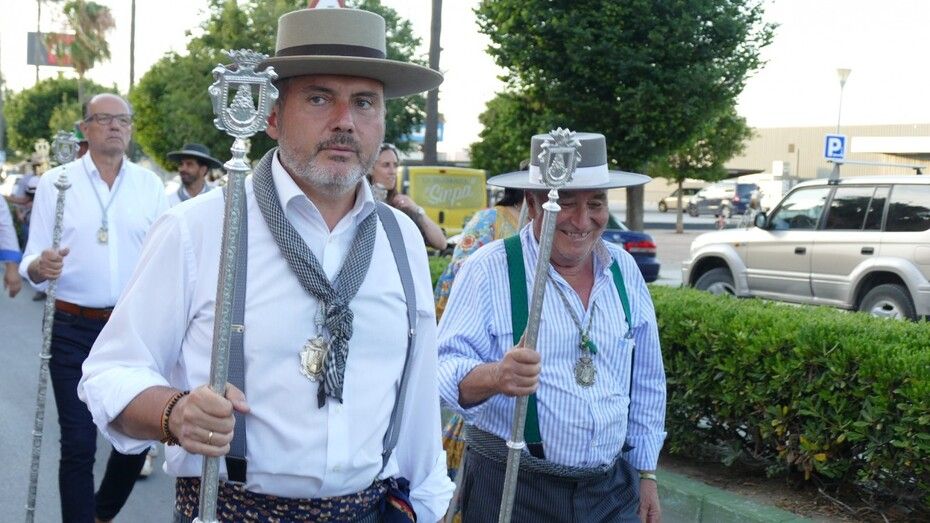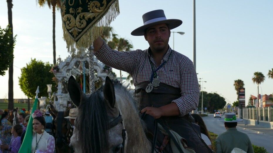 Tres caballos abriendo paso, las banderas portadas por mujeres y una decena de niños como muestra de la cantera que tiene la hermandad, además de miembros de la junta de gobierno, han precedido a la carreta blanca y de plata engalanada para esta entrada y su recta final antes de que empiece su desmontaje hasta el año que viene.