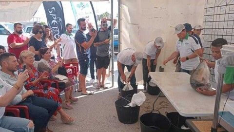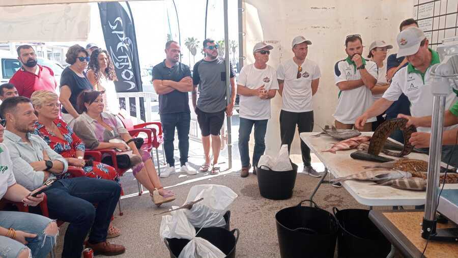 Tras una mañana en la que los equipos de pesca se lanzaron al mar para las capturas, a las tres, los 33 participantes de los once equipos hacían entrega de los pescados en el pantalán de espera del puerto deportivo, a la espera del pesaje que se inició ayer sábado, sobre las cuatro y media de la tarde.
