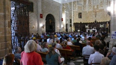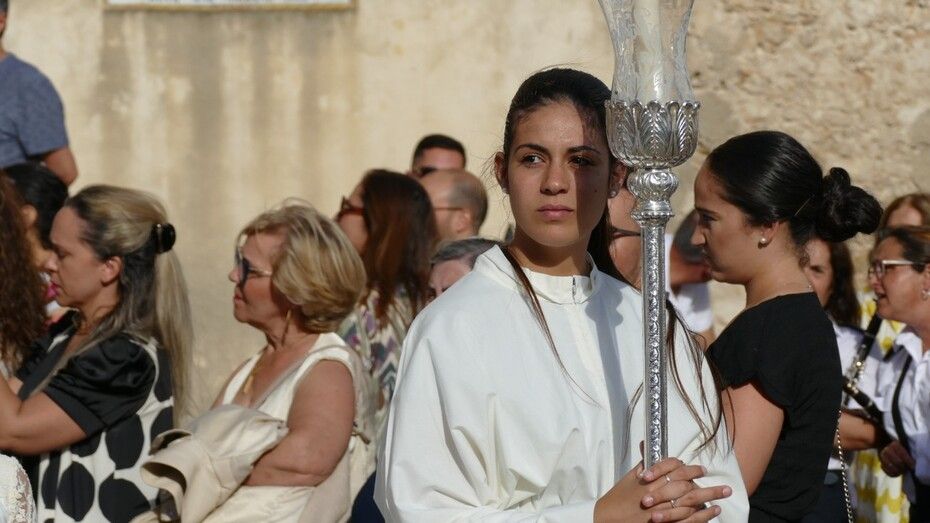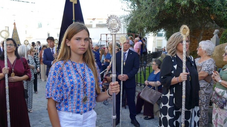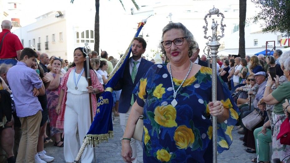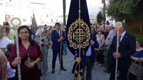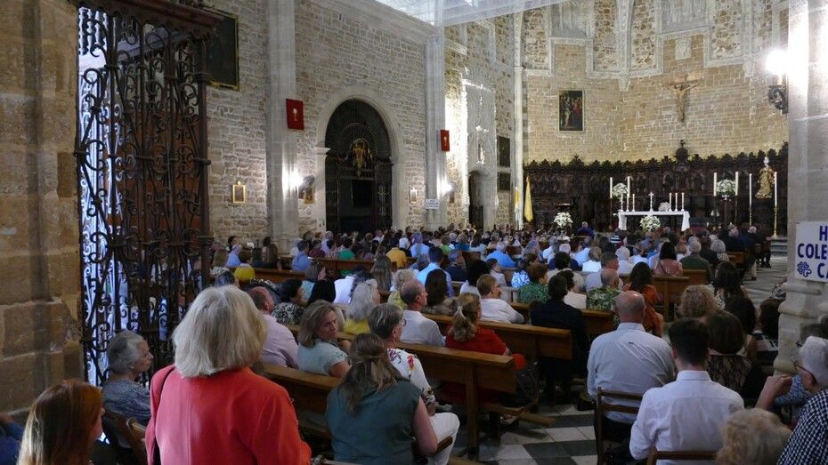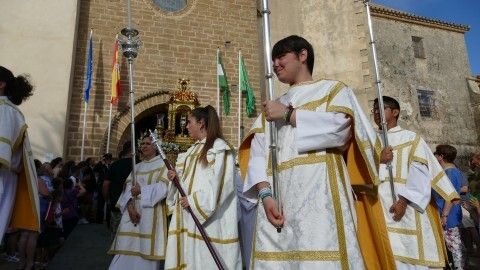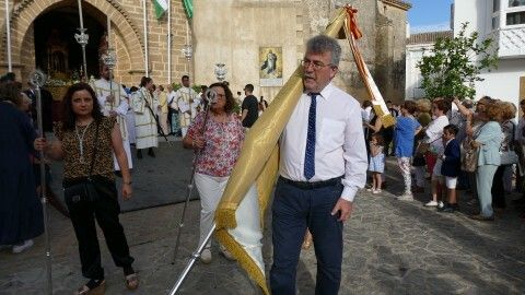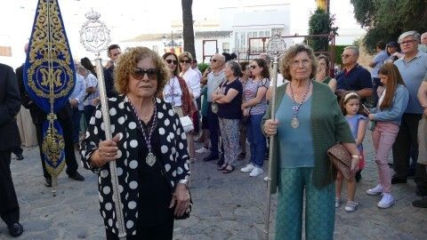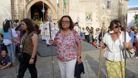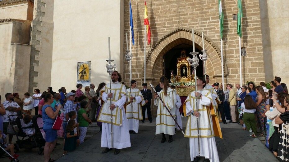 Sobre las siete y cuarto de la tarde, y tras una eucaristía que ha llenado la parroquia de Nuestra Señora de la O, comenzaba la salida procesional del Santísimo Sacramento por una plaza Bartolomé Pérez que fue llenándose de público.