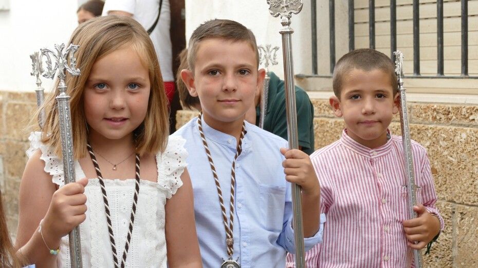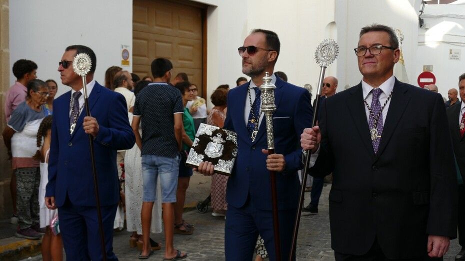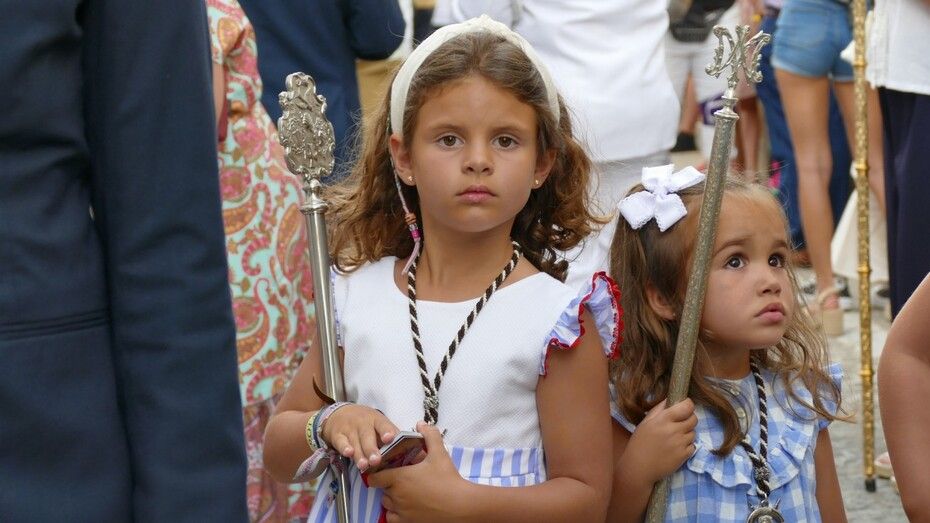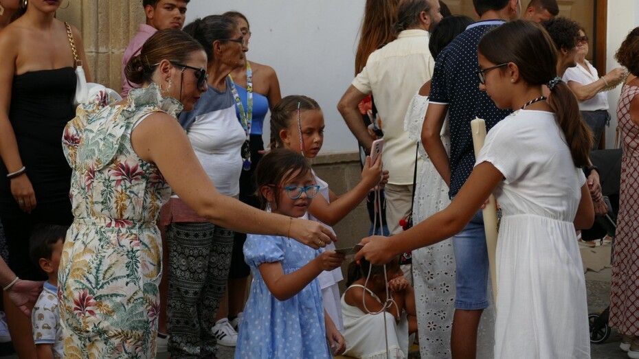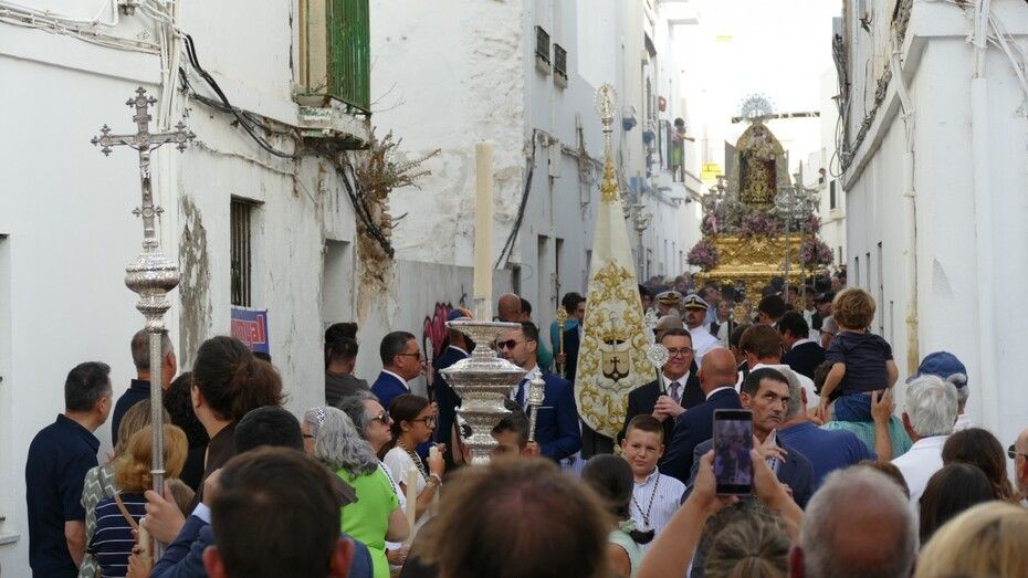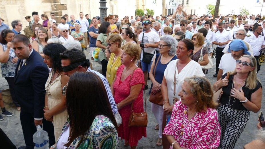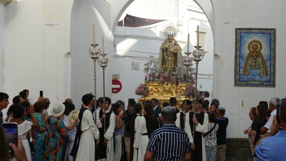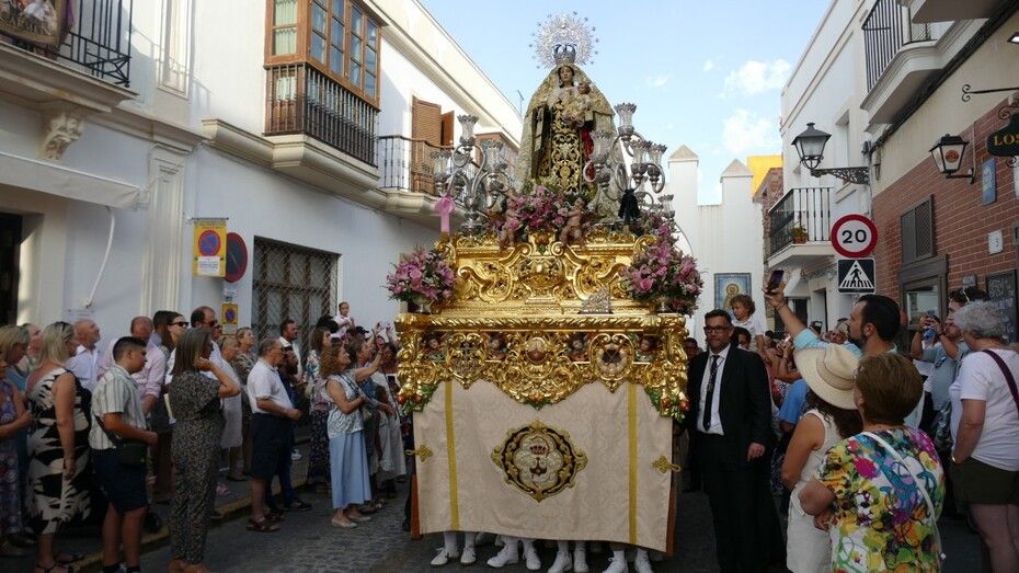 El repique de campanas desde la parroquia de Nuestra Señora de la O anunciaba la salida de la virgen en una plaza Bartolomé Pérez e inmediaciones que esperaba llena de público para verla en el día de su onomástica Lucía su saya y manto nuevos estrenados el año pasado, y unos pendientes restaurados que podrían datar de finales del siglo XVIII o principios del XIX.