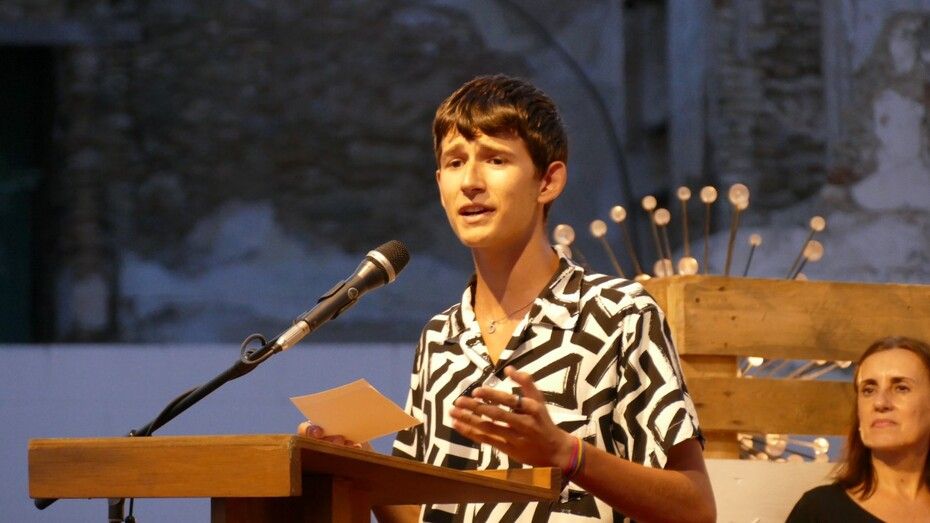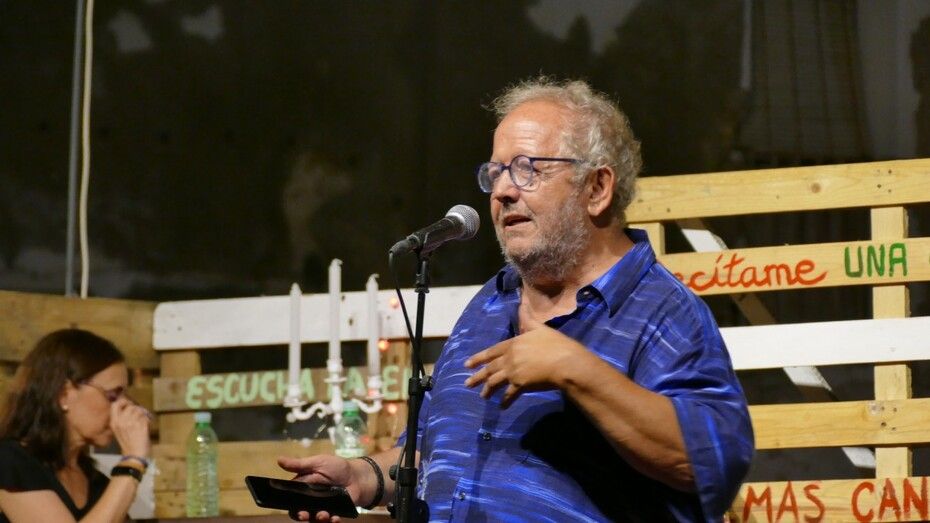 [Img #200656]Benjamín Prado fue directamente al grano. Se arrancó con un poema dedicado a su amigo Luis García Montero, con quien forma el dúo que hasta ahora no se ha perdido ninguna edición de este evento cultural. La pérdida de Almudena Grandes convirtió al poeta granadino en viudo, "el segundo viudo", al que su amigo le dedicó los versos elegidos para la cita de ayer. "Sé que el dolor ha llegado para quedarse" y que "las historias felices -como la de Almudena y Luis-, también acaban mal", dirigió a un Luis emocionado entre el público que pudo sentir el arrope de quienes escuchaban al madrileño que también recibió el aplauso por su poema dedicado a España, "la capital de la alegría".