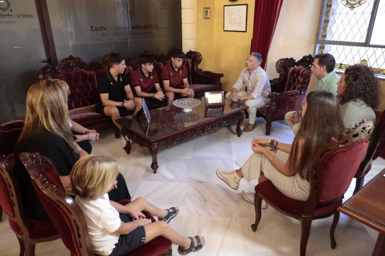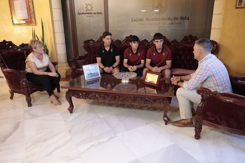 Esta semana, el alcalde de Rota, Javier Ruiz Arana, ha recibido en el Palacio Municipal Castillo de Luna a tres roteños que han participado en un torneo internacional de fútbol en China. Se trata concretamente de los jugadores Gabriel Reyes y Manuel Letrán y el entrenador Pedro Mateos, todos ellos pertenecientes al equipo de fútbol categoría cadete División de Honor del Cádiz C.F.