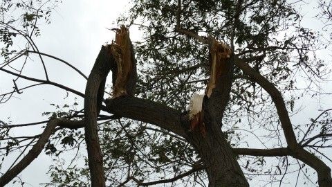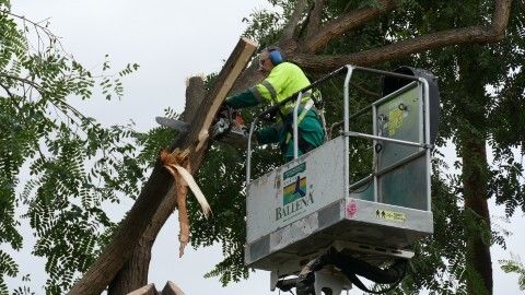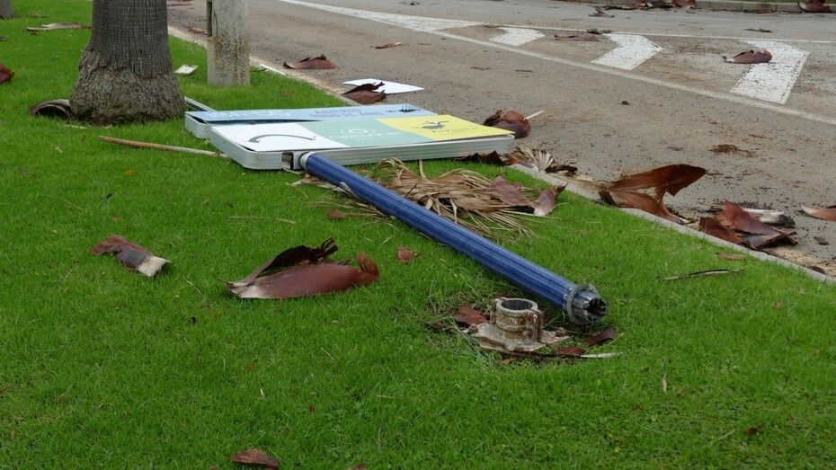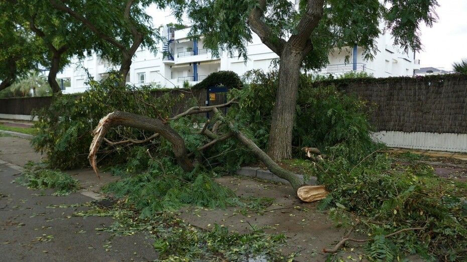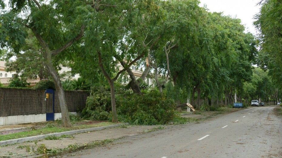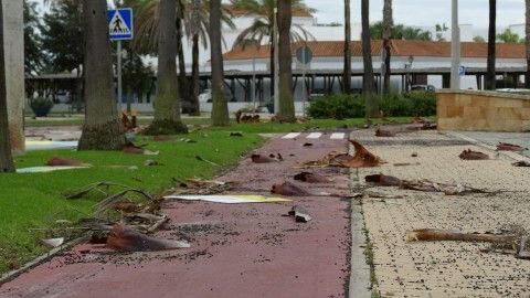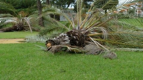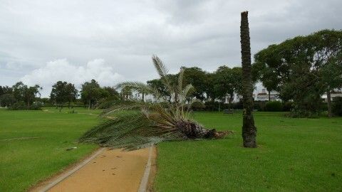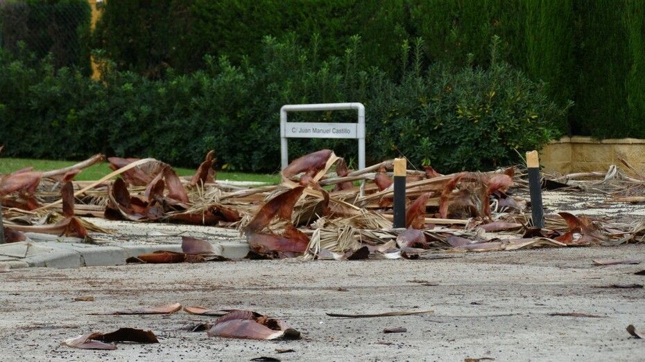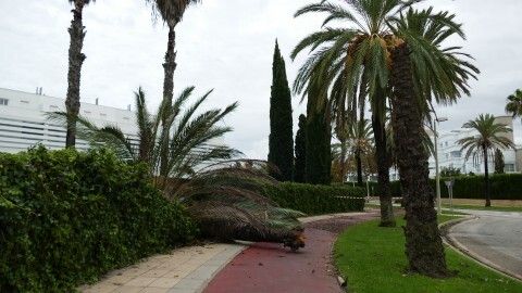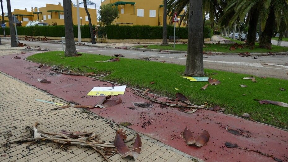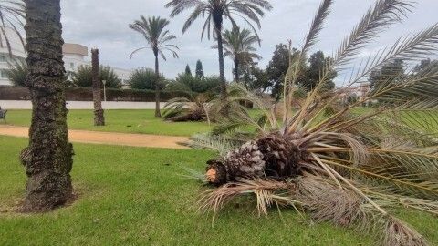 De momento, se han contado más 20 palmeras de  entre 6 y 8 metros de altura, tipo tipuanas o datileras, las que han quedado eliminadas por el viento y tendrán que ser retiradas en su totalidad; otros ejemplares han sufrido daños y habrá que ver aquellos que se han quedado en estado de peligro sobre los que también habrá que acabar actuando por la seguridad de todos.