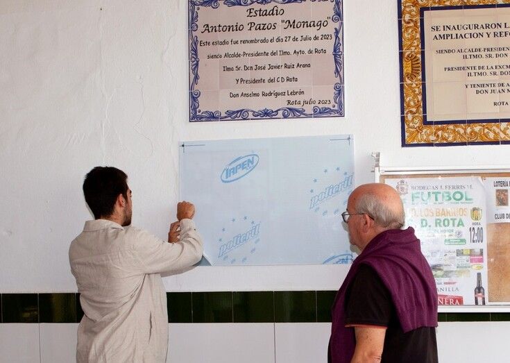 [Img #205387]El pasado mes de julio se rotuló de forma oficial el estadio del CD Rota, antes llamado 'Alcalde Navarro Flores', con el nombre de Antonio Pazos Puyana 'Monago', el que fuera presidente de esta entidad deportiva desde 1970 a 1987. Sin embargo, es cierto que, aunque muchos aficionados de cierta edad recuerdan a la perfección el trabajo que hizo a favor del CD Rota para convertirlo en un club serio y respetado por sus rivales, muchas de las nuevas generaciones desconocen su trayectoria y la importancia que tuvo para el Rota, por ello, se ha decidido que además de la rotulación en la fachada que ya se hizo en verano, se le añadiera a la entrada una placa en la que se reflejara la figura de Antonio Pazos 'Monago' con texto y fotos.